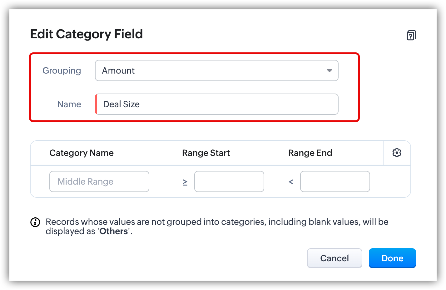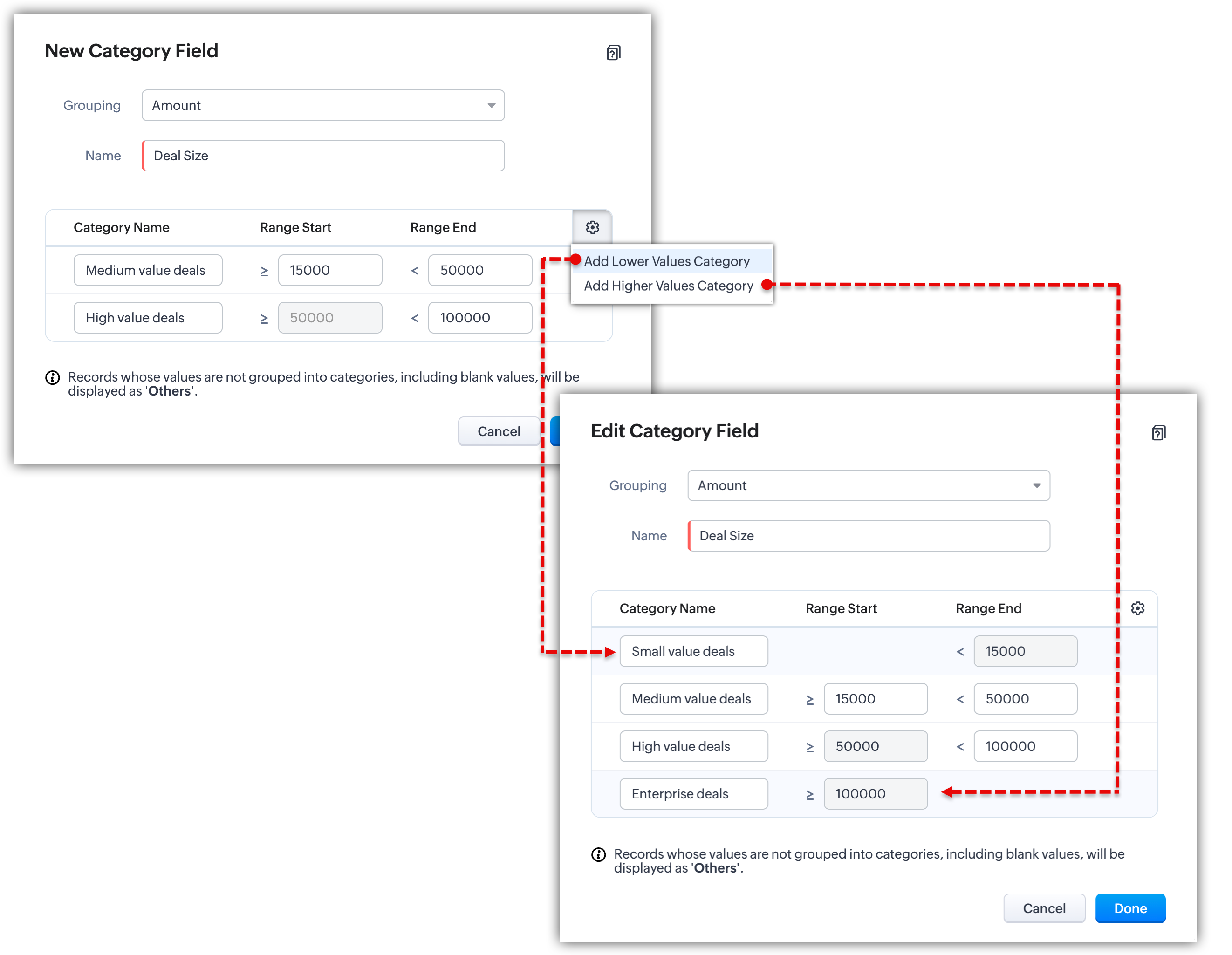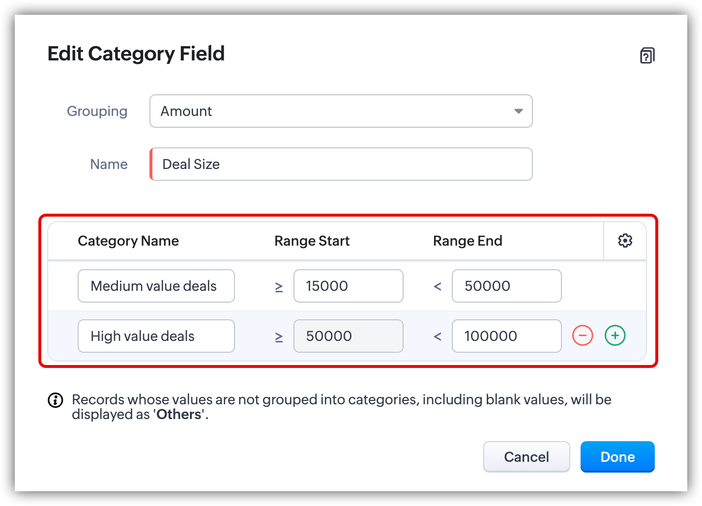 Additionally, you can use the Lower Values Category option to capture all deal amounts below 15,000, naming this category "Small Value Deals." Similarly, using the Higher Values Category option will group all deal amounts exceeding 100,000 into "Enterprise Deals." While creating categories for a numerical field, the range values are designed to be continuous to ensure no value unintentionally falls into the uncategorized "Others" section. Once you save the component, the data will be categorized based on these configurations, making it easier to identify trends and act on insights.
