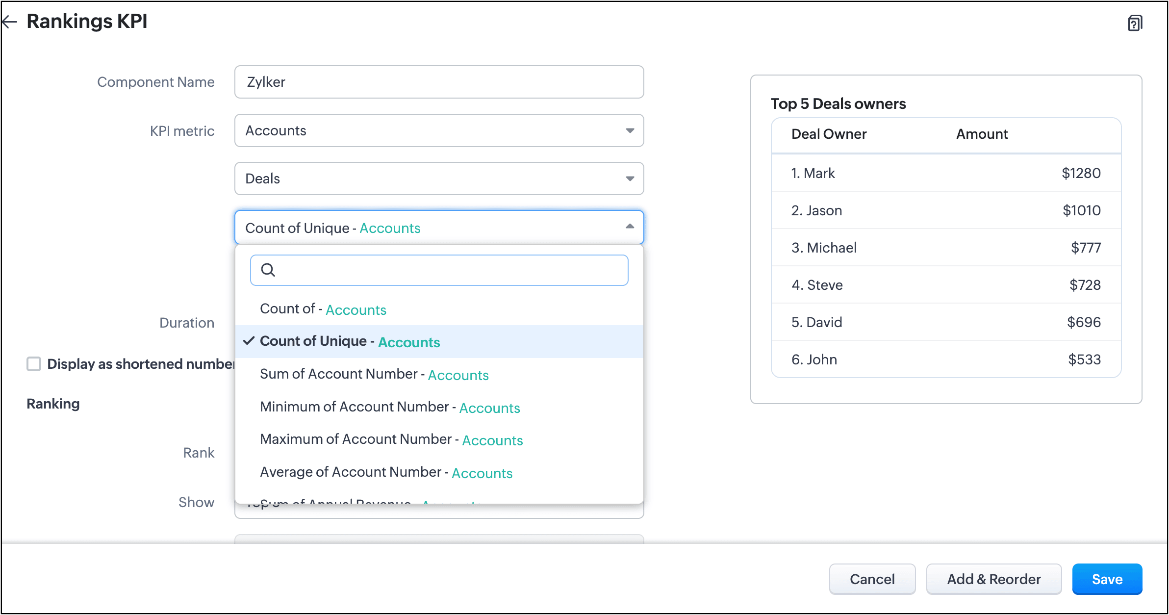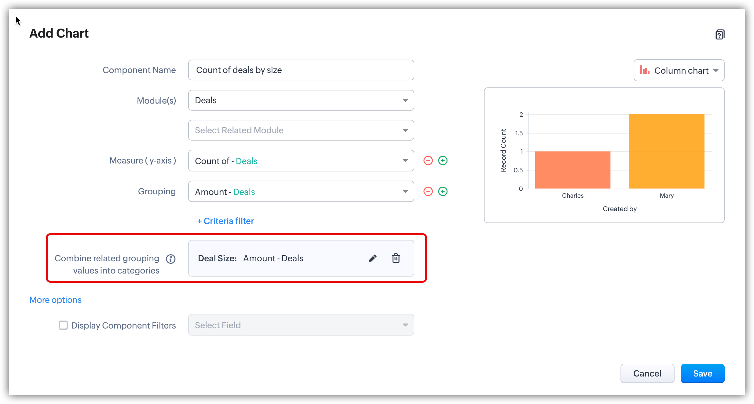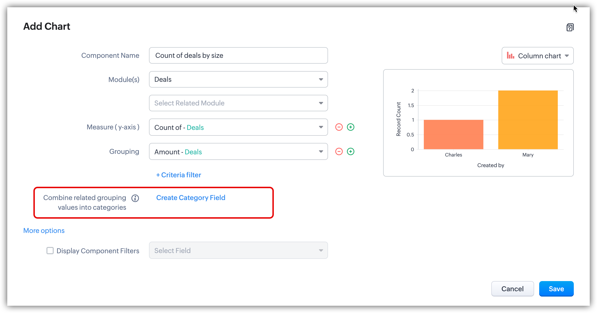 Additionally, you can use the Lower Values Category option to capture all deal amounts below 15,000, naming this category "Small Value Deals." Similarly, using the Higher Values Category option will group all deal amounts exceeding 100,000 into "Enterprise Deals." While creating categories for a numerical field, the range values are designed to be continuous to ensure no value unintentionally falls into the uncategorized "Others" section. Once you save the component, the data will be categorized based on these configurations, making it easier to identify trends and act on insights.