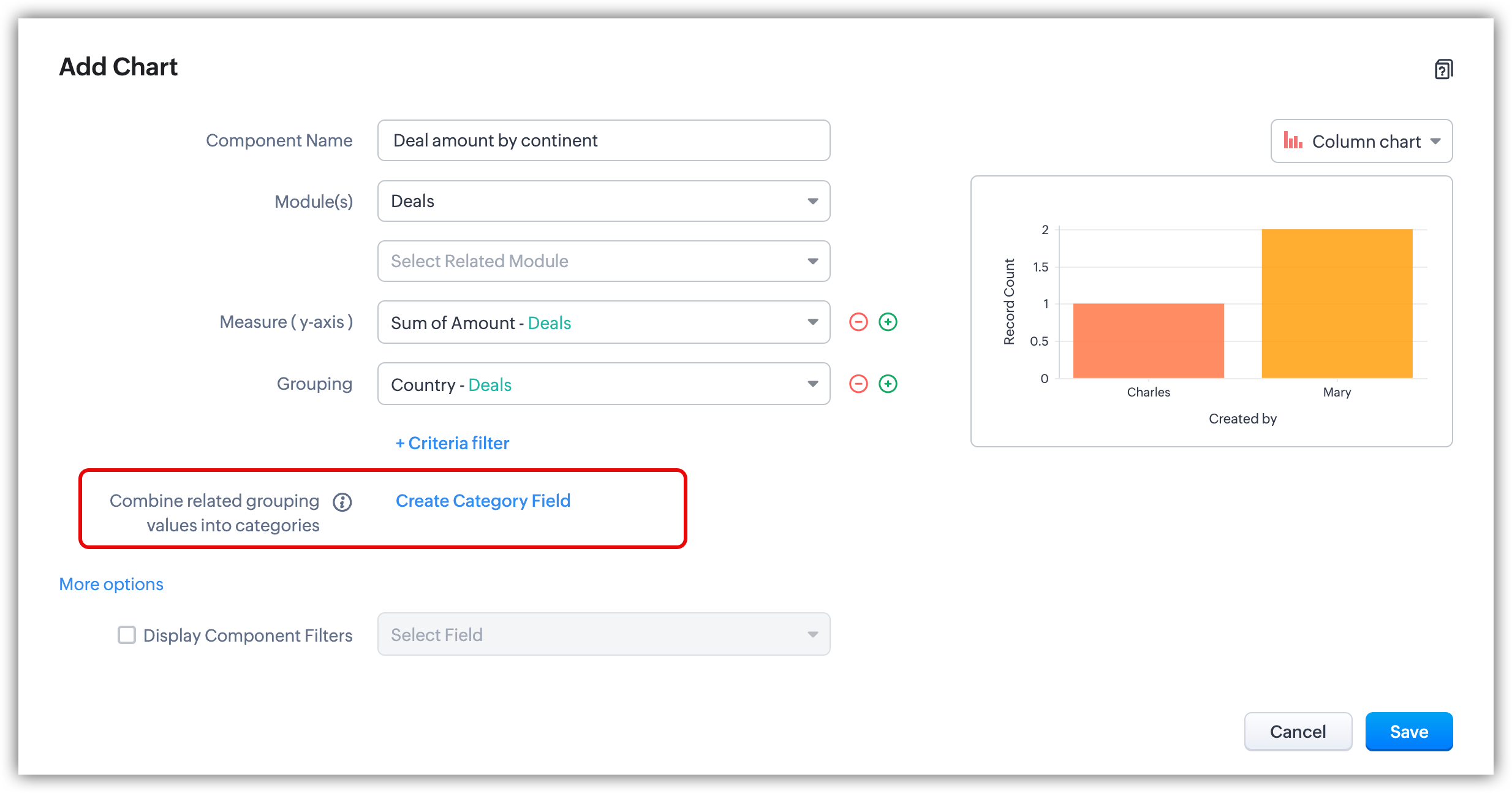 Imagine you have a picklist field Country as a grouping field in a chart component. Analyzing each country individually can be overwhelming and time-consuming. Additionally, you might have business goals that require monitoring or analyzing these deals by grouping them into certain categories, such as regions/continents.