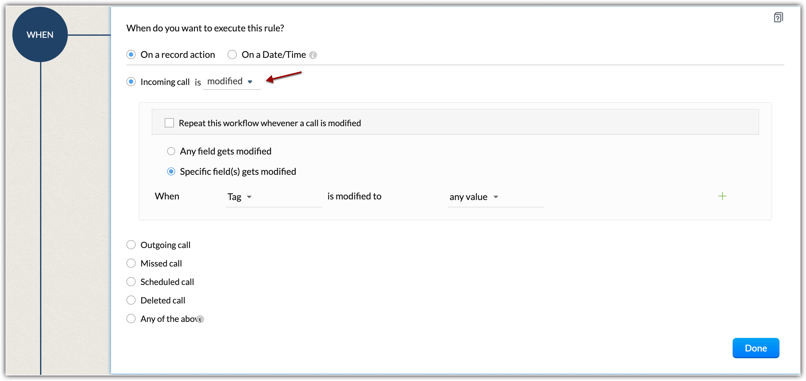 Specific field(s) gets modified - Select this to trigger workflow when a specific field gets modified. Provide the field trigger conditions.