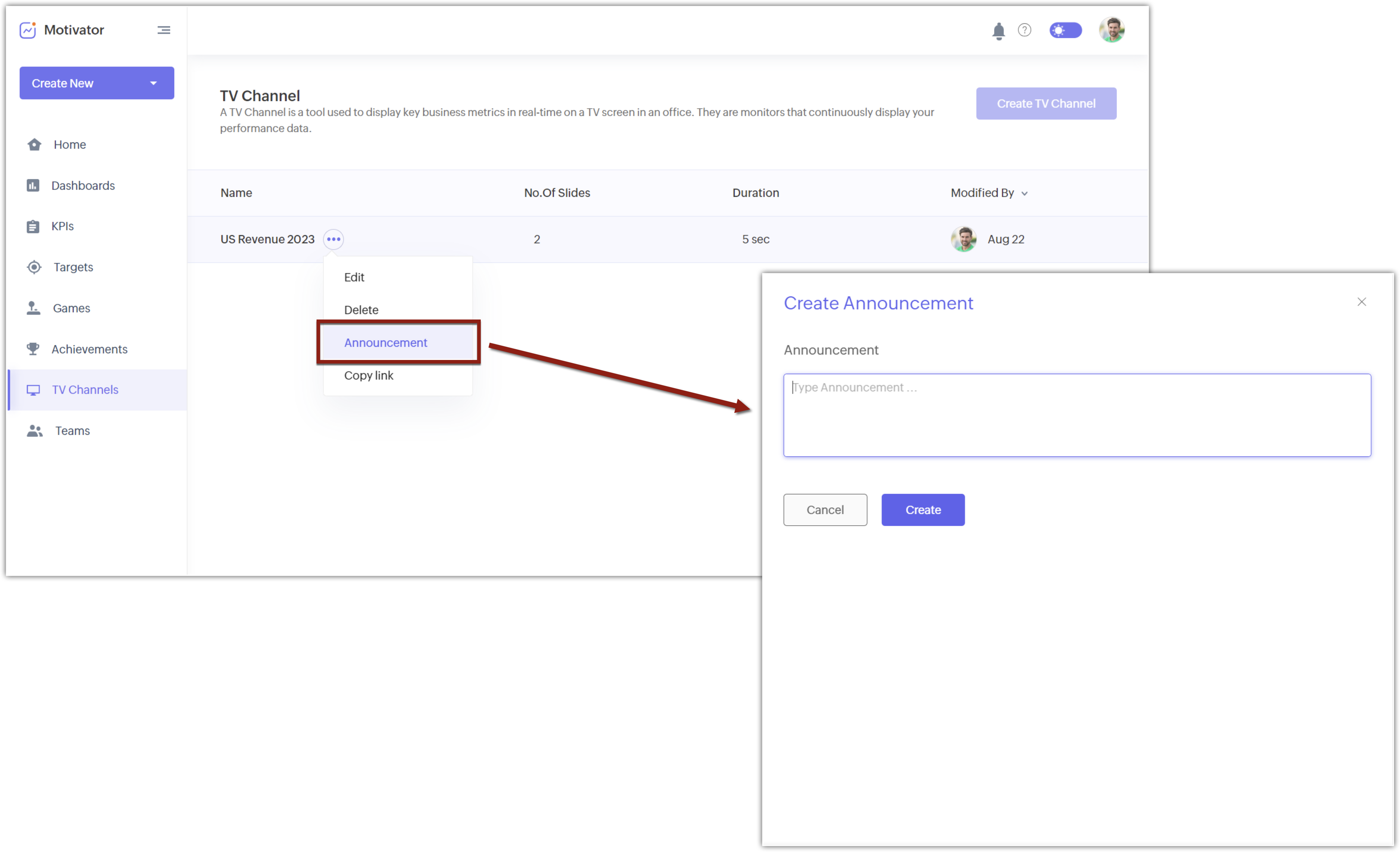 Announcement functionality in TV channel enables you to include important messages right in your channel's broadcast, offering a more dynamic way to share critical updates or information. Whether it's a significant achievement, an urgent directive, or spotlighting a department's breakthrough, your displayed message will ensure everyone's alignment and awareness.