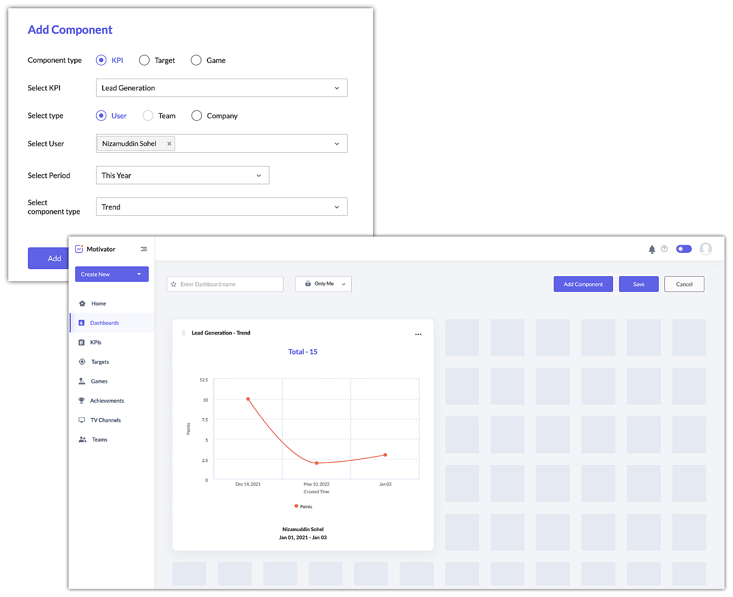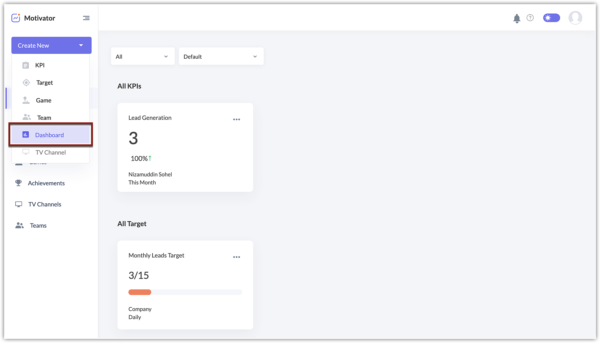 A system-defined default dashboard will display all the KPIs, targets, and games. You can also create a custom dashboard and add the components of your choice and share it with everyone or mark it as a favorite.