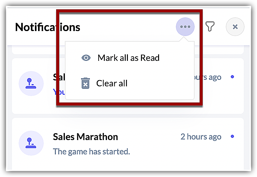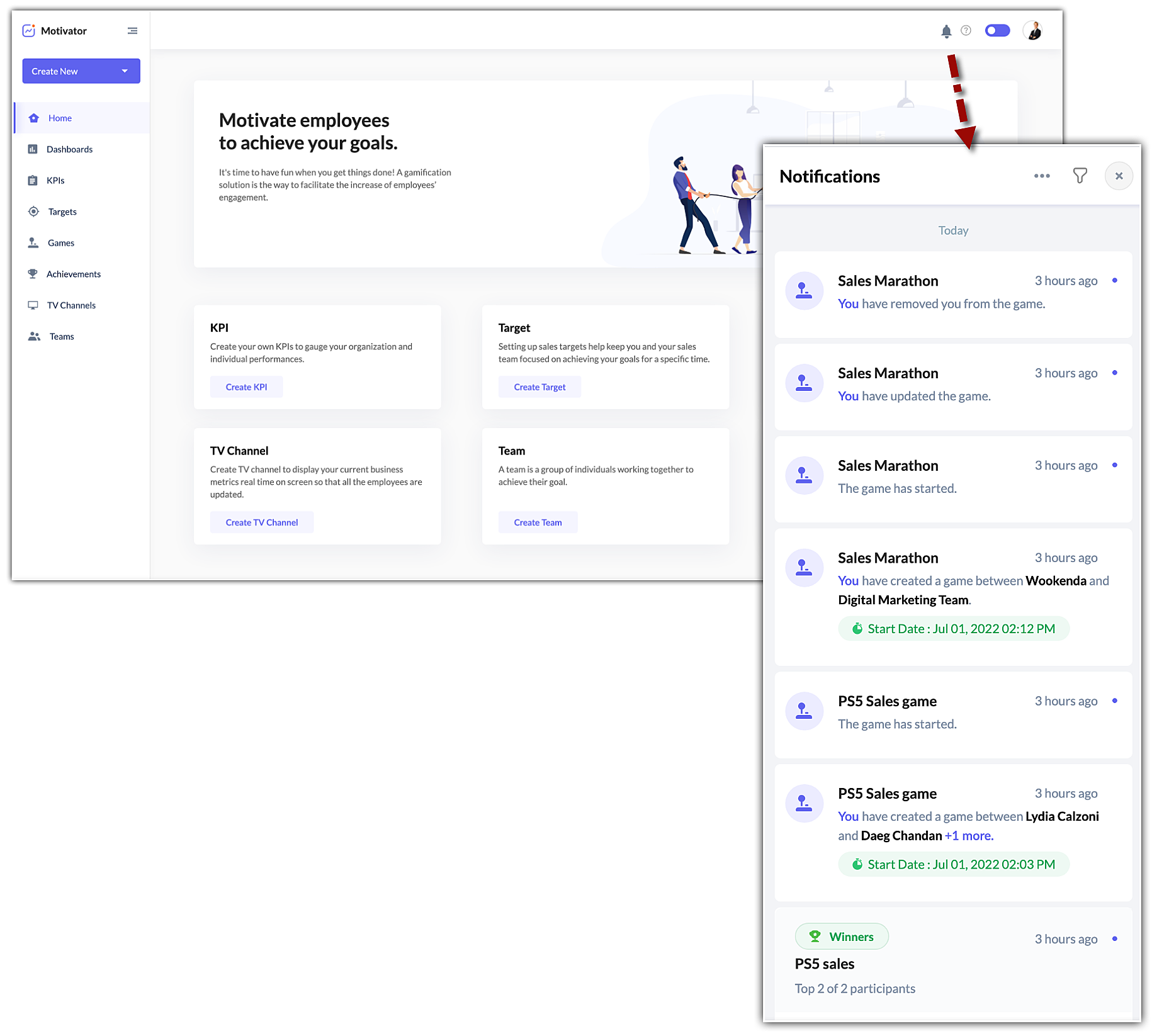 For every updates or progress made in your organization with regards to the KPIs or games or targets, you will be notified in the notification panel. It help you keep track of the changes in KPIs, when they are updated or deleted, or when a user levels up or down in a particular game, etc., and stay updated about your team's performance.