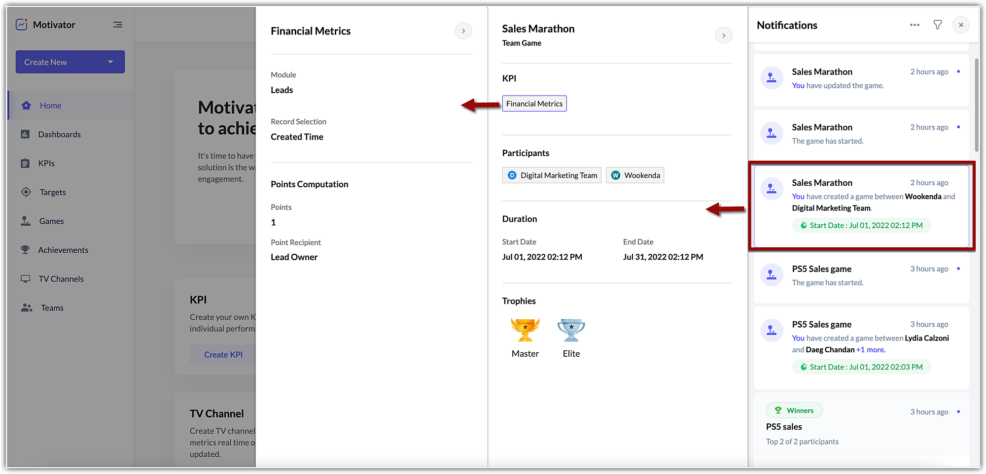 - For KPIs: If an user is associated with a target or an ongoing game they will get notified about KPIs. Apart from them, the organizer, participants, or viewers would also get notified about different changes and other actions.
