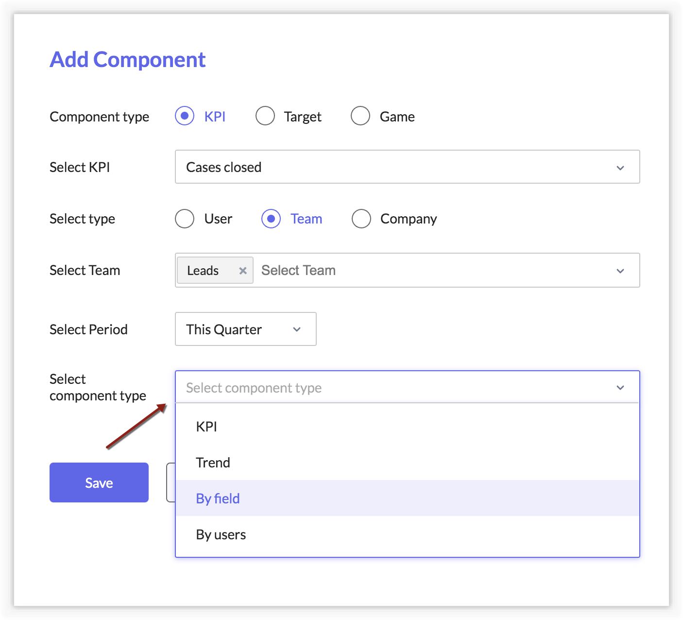 The component type could be KPI Overview,Trend, By Field, or By users.