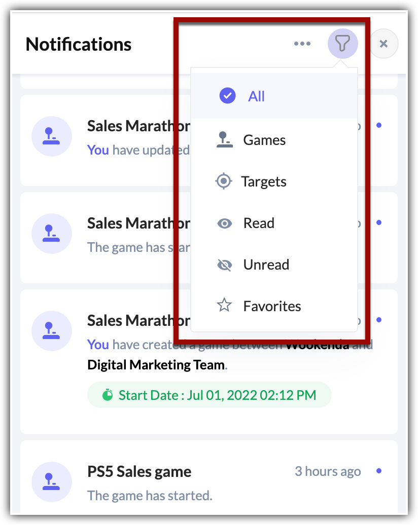 - On the notification panel you can filter notifications— view all notifications, or only notifications related to games, targets, or read, unread, or favourited notifications.