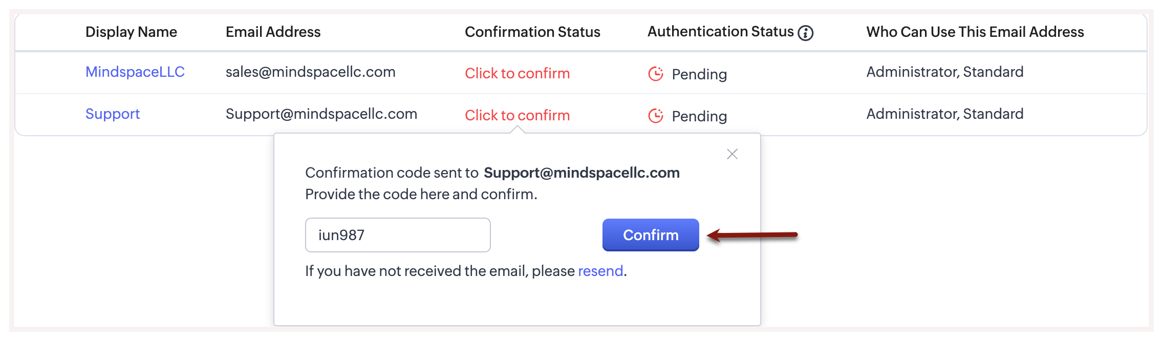 - As soon as a new organization email is added a confirmation code will be sent to the specified email address.