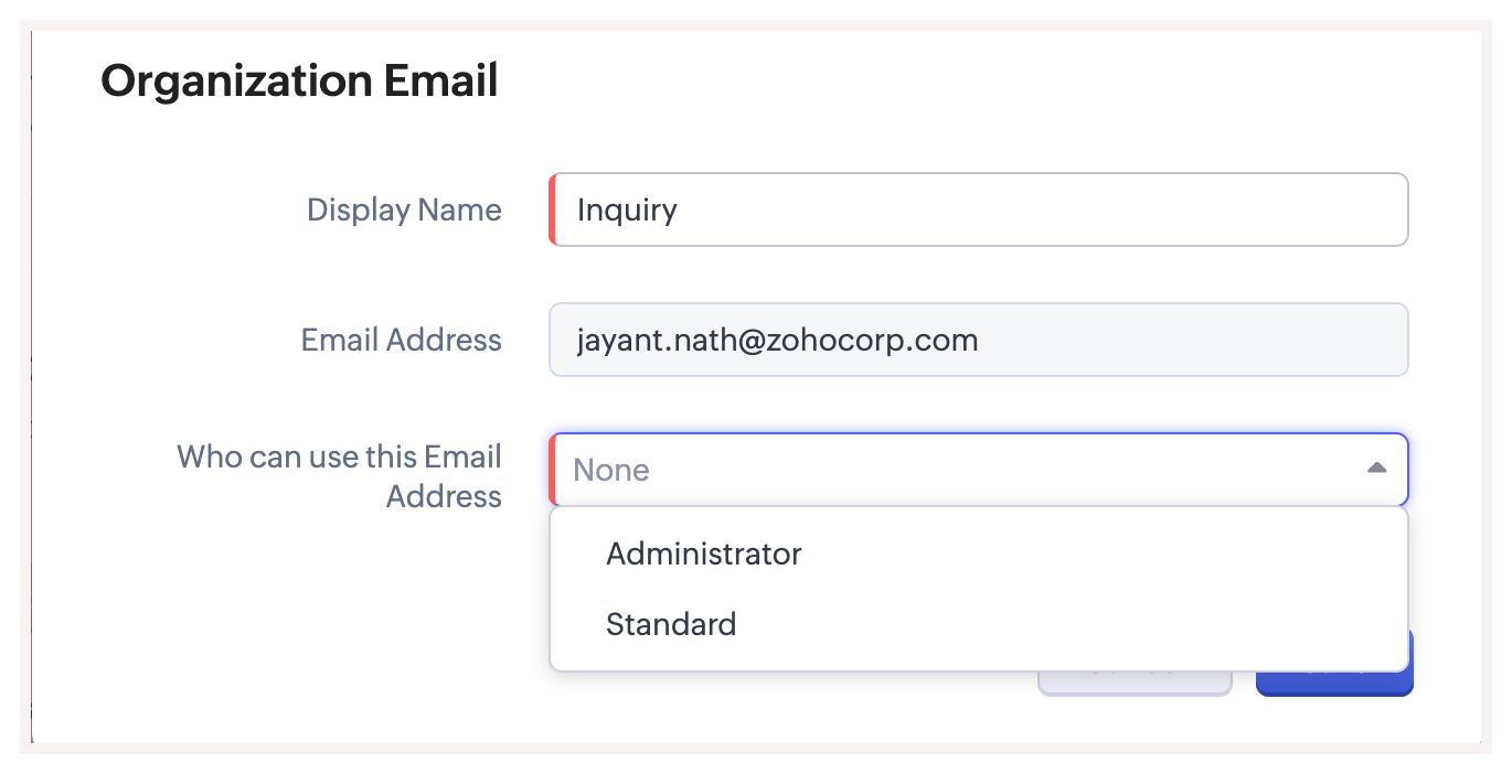 When adding an organization email address, you can specify users with which profile can access the organization email address.