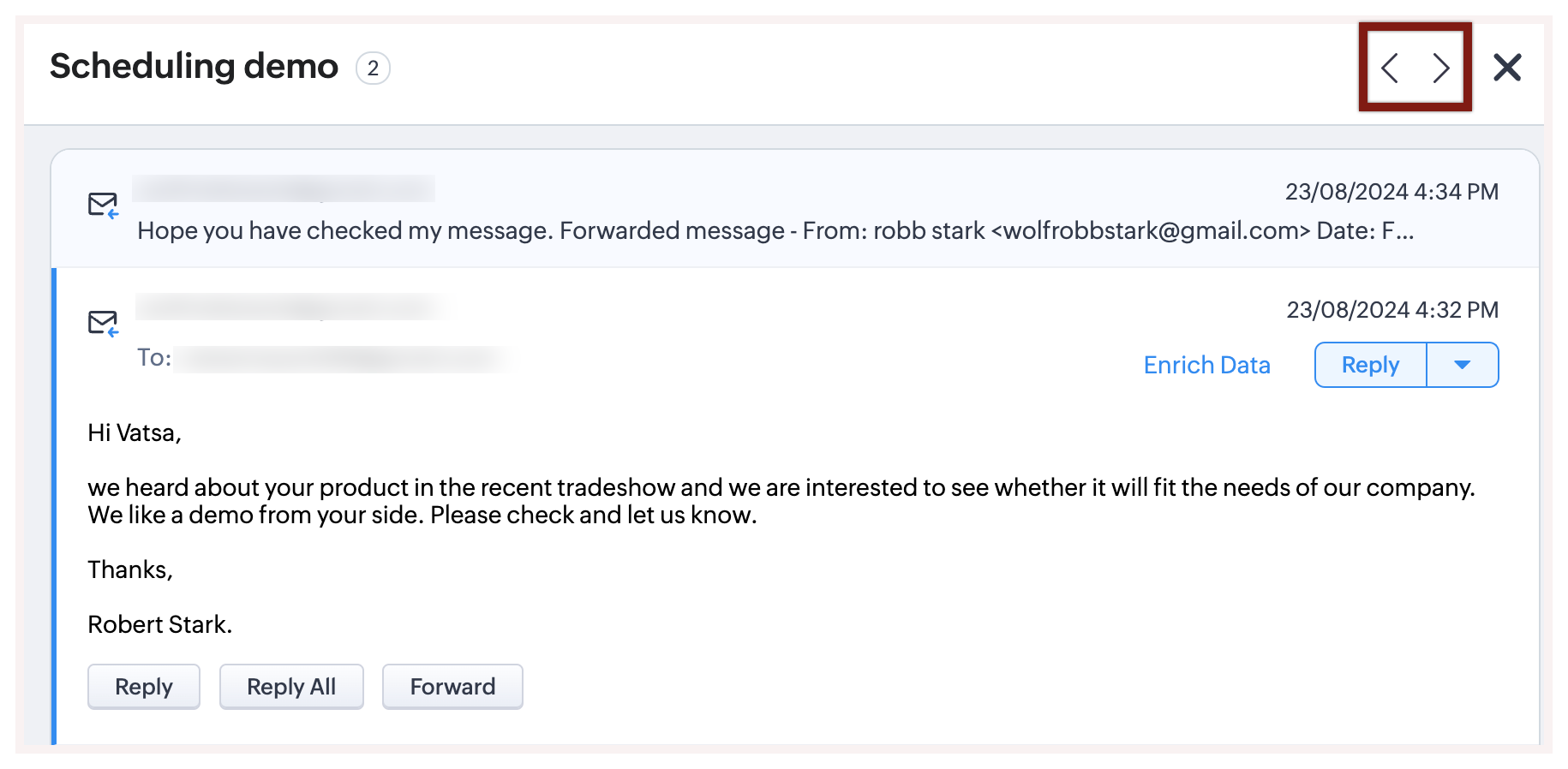 - You can navigate to the previous or next email from within an email by using the navigation buttons.
