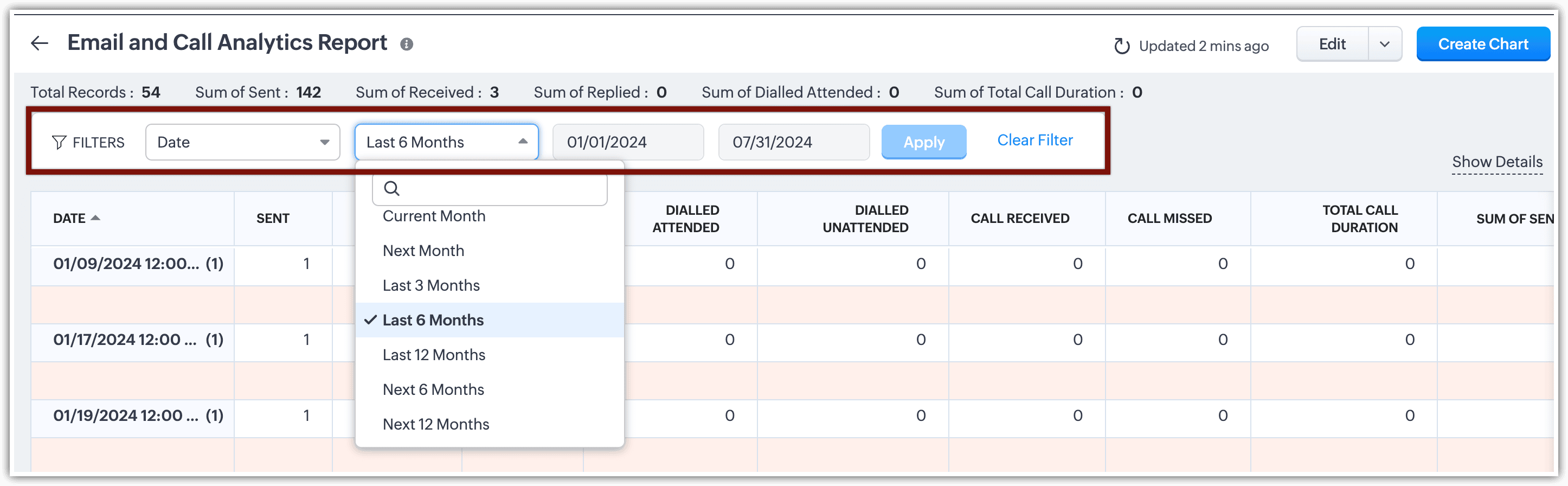 4. In the Email Analytics page, you will be able to choose the parameters by which the email statistics are to be filtered. For example, Date Range, Groups, Columns, Advanced filters, and so on.