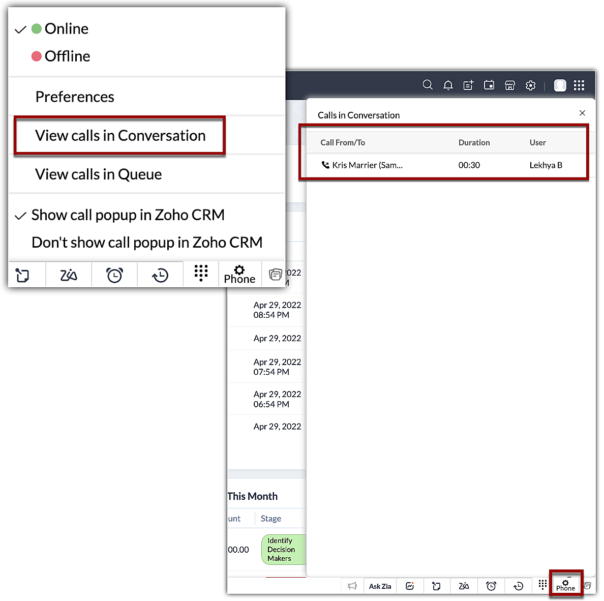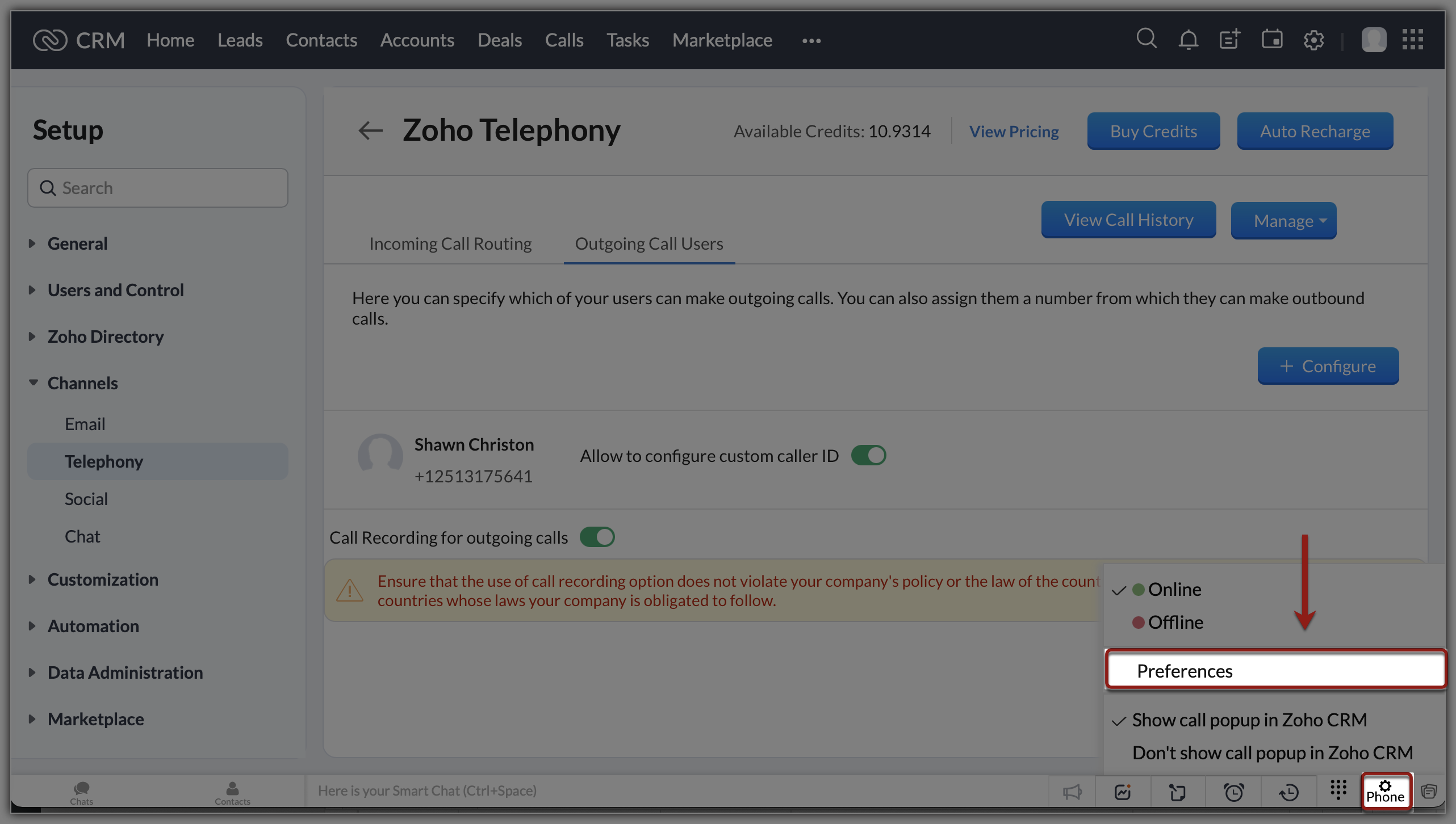 - Click the Phone option at the bottom of CRM and select Preferences .