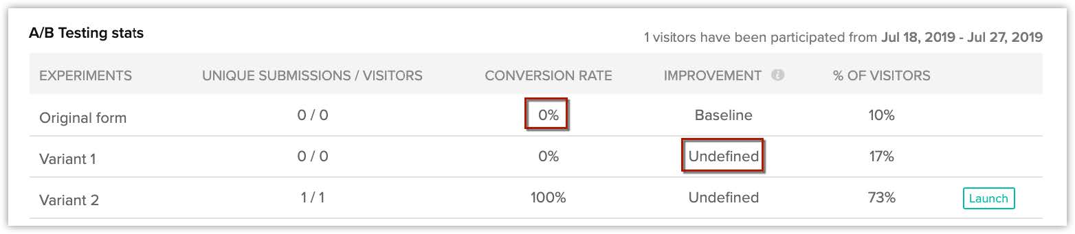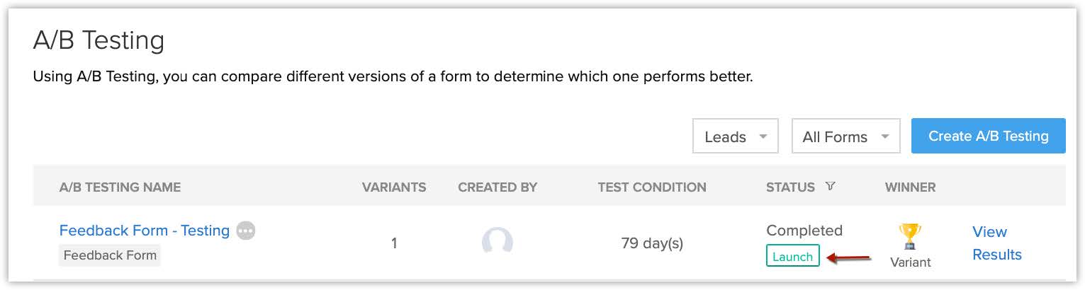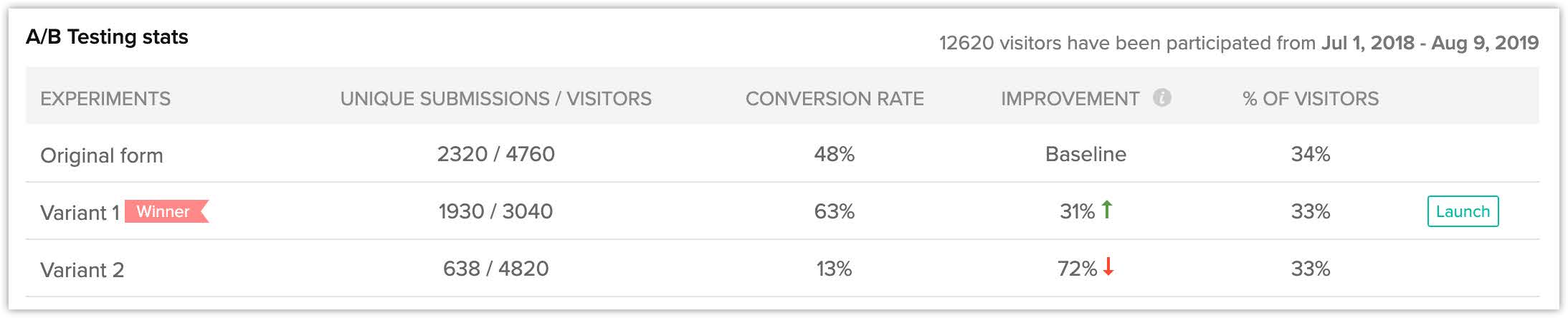 4. Once the A/B test is complete, only the original form will be available for visitors until another variant is launched.
