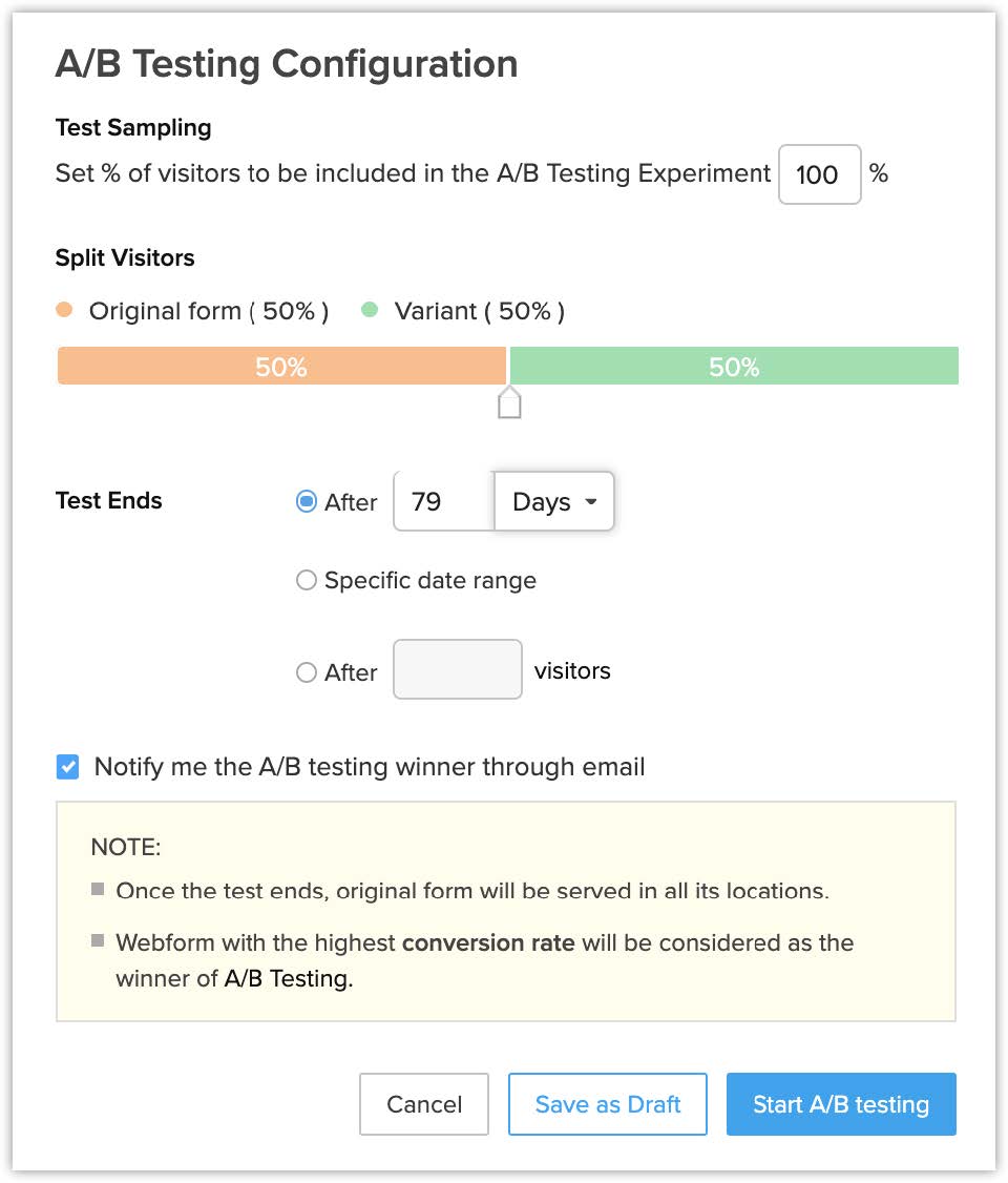 Setting up A/B Testing involves defining the percentage of visitors that should be roped in for the A/B testing. Further, the percentage of visitors who should view the original webform and the variants should also be specified. The date and time or the number of visitors after which the A/B Testing should end determines the duration of your A/B Testing. You can also save the A/B Testing configuration as draft.