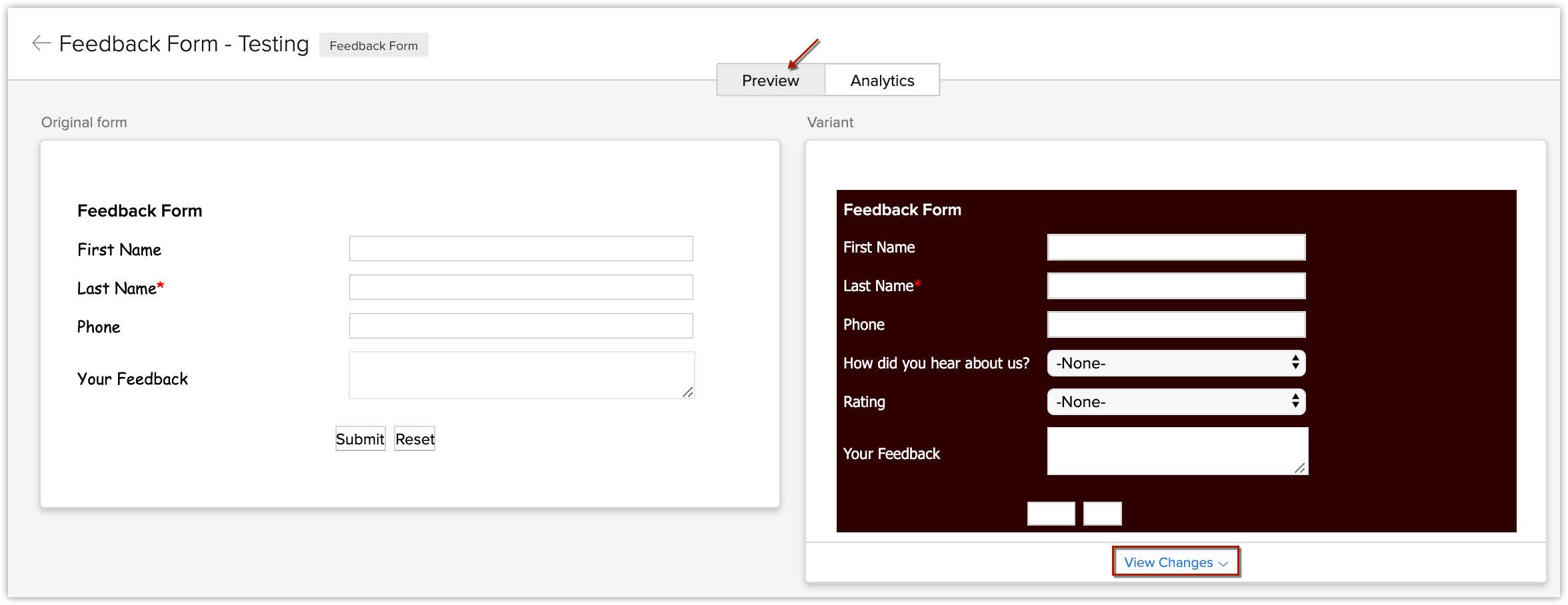 The Preview tab displays the original form and the variants that you have created for testing. You can preview the form variants in full screen by clicking the Expanded View icon (). You can also see the changes made to the variants compared to the original form.
