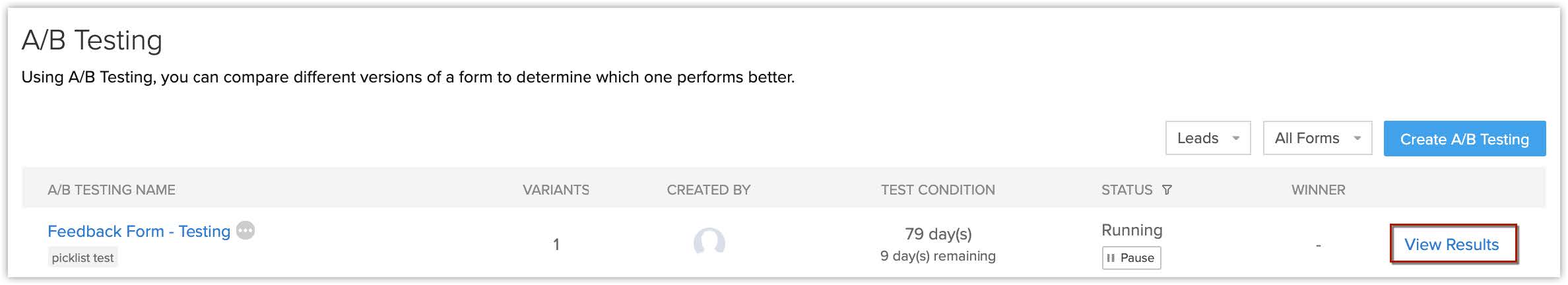 Once A/B testing is completed, you can view the status and the statistics on the performance of the original form and the variants.