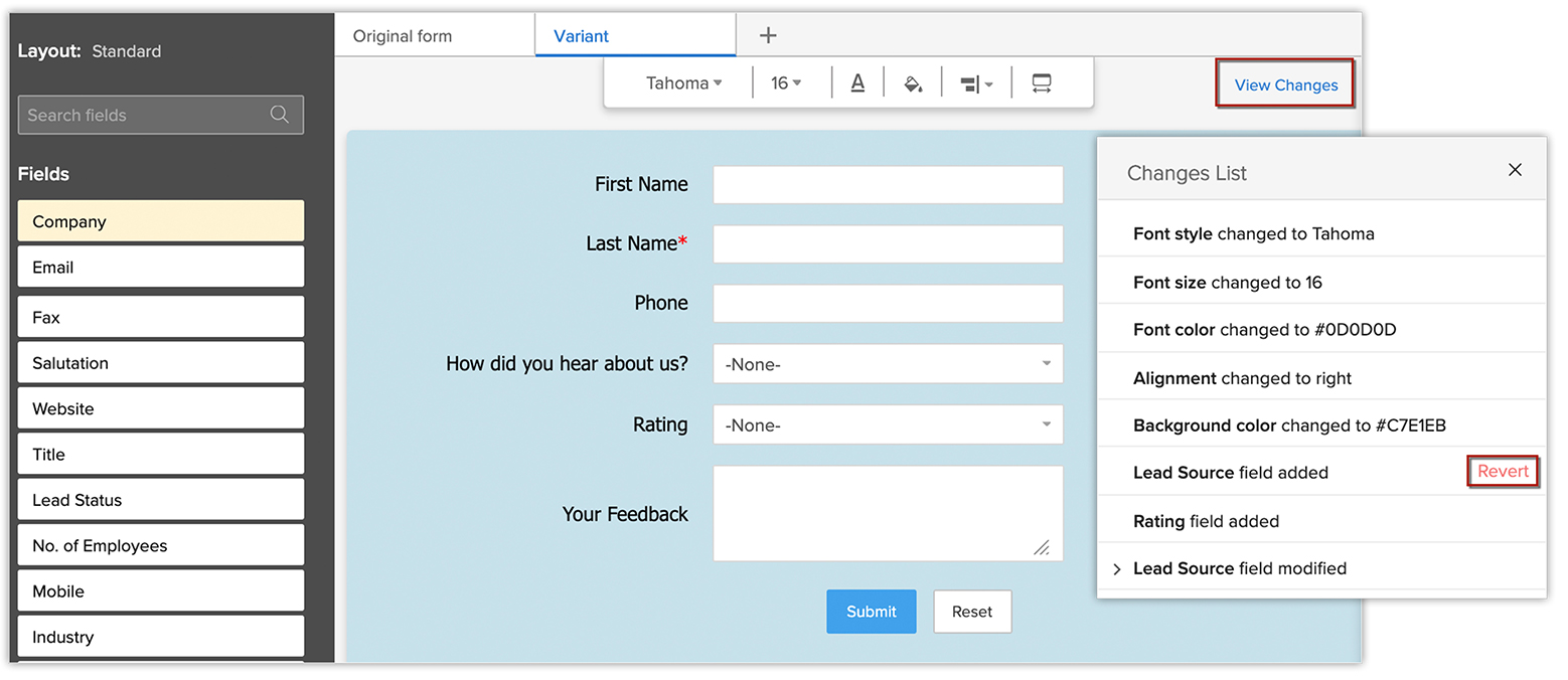 You can create different versions of the original webform by including more fields, modifying the field properties, changing the Call To Action buttons, changing fonts, revising the background color of the form and so on. All the changes that you make in the variant can be viewed from the Changes List. You can also revert the changes, if necessary.
