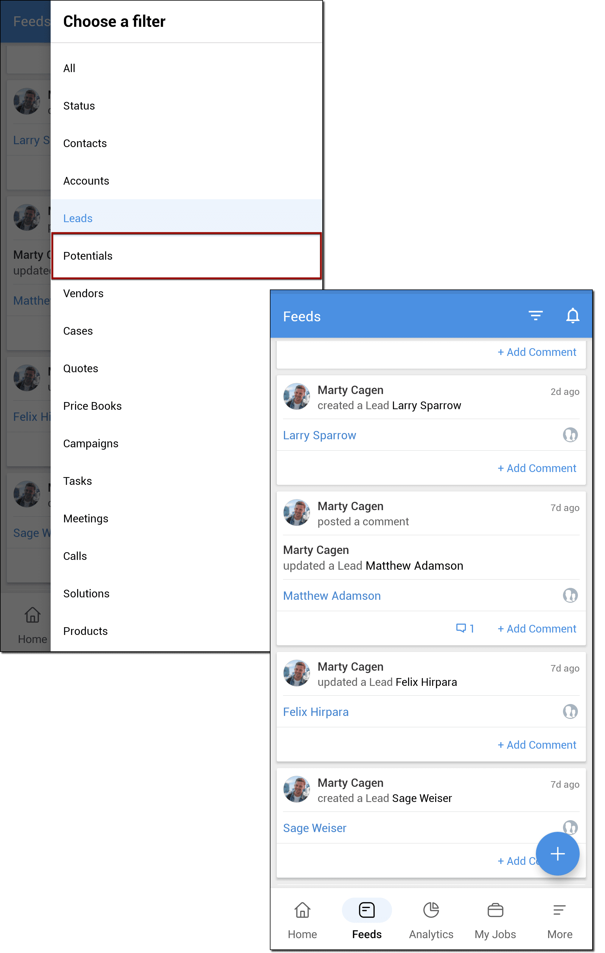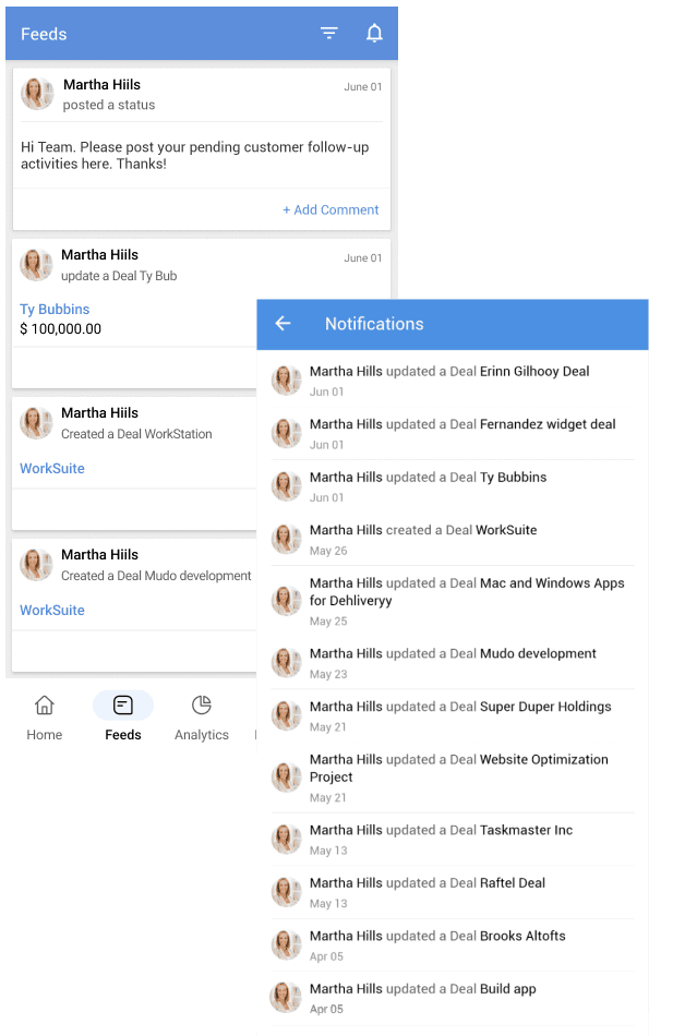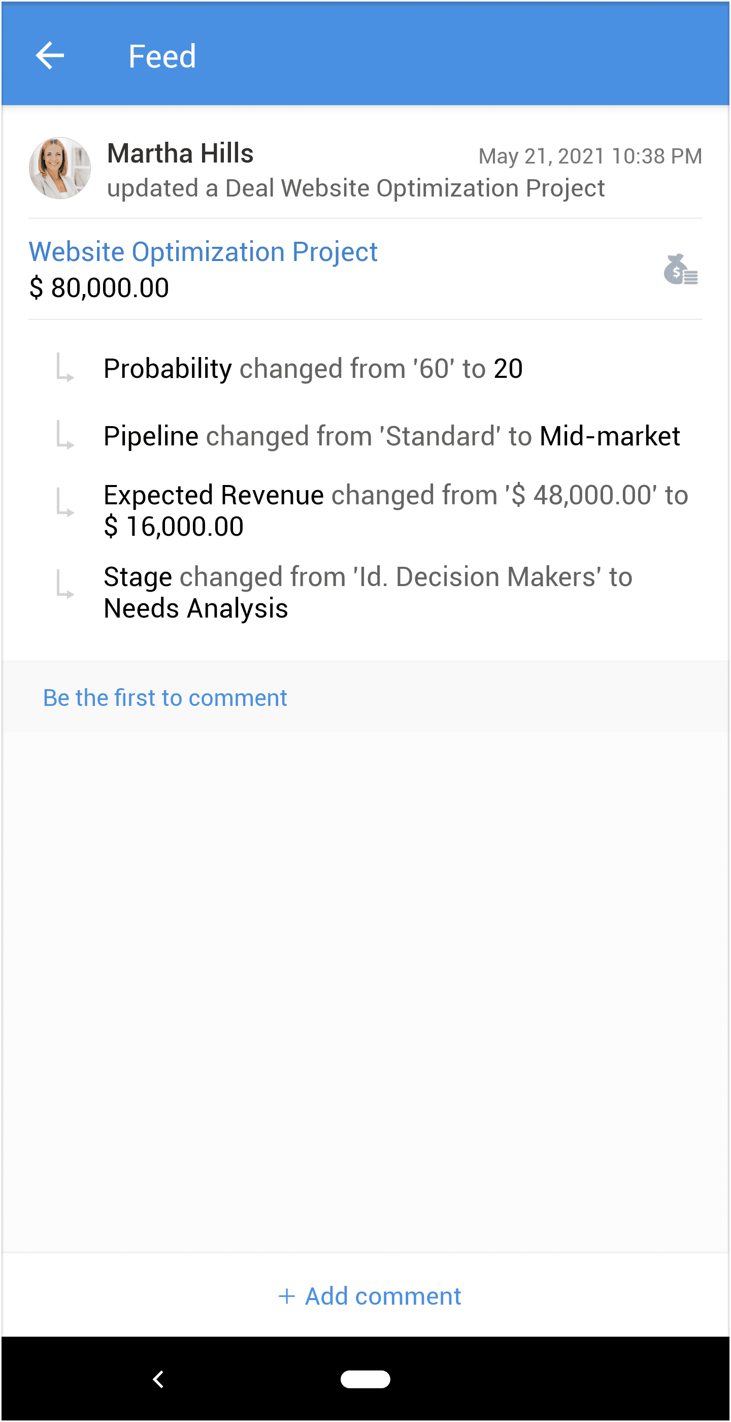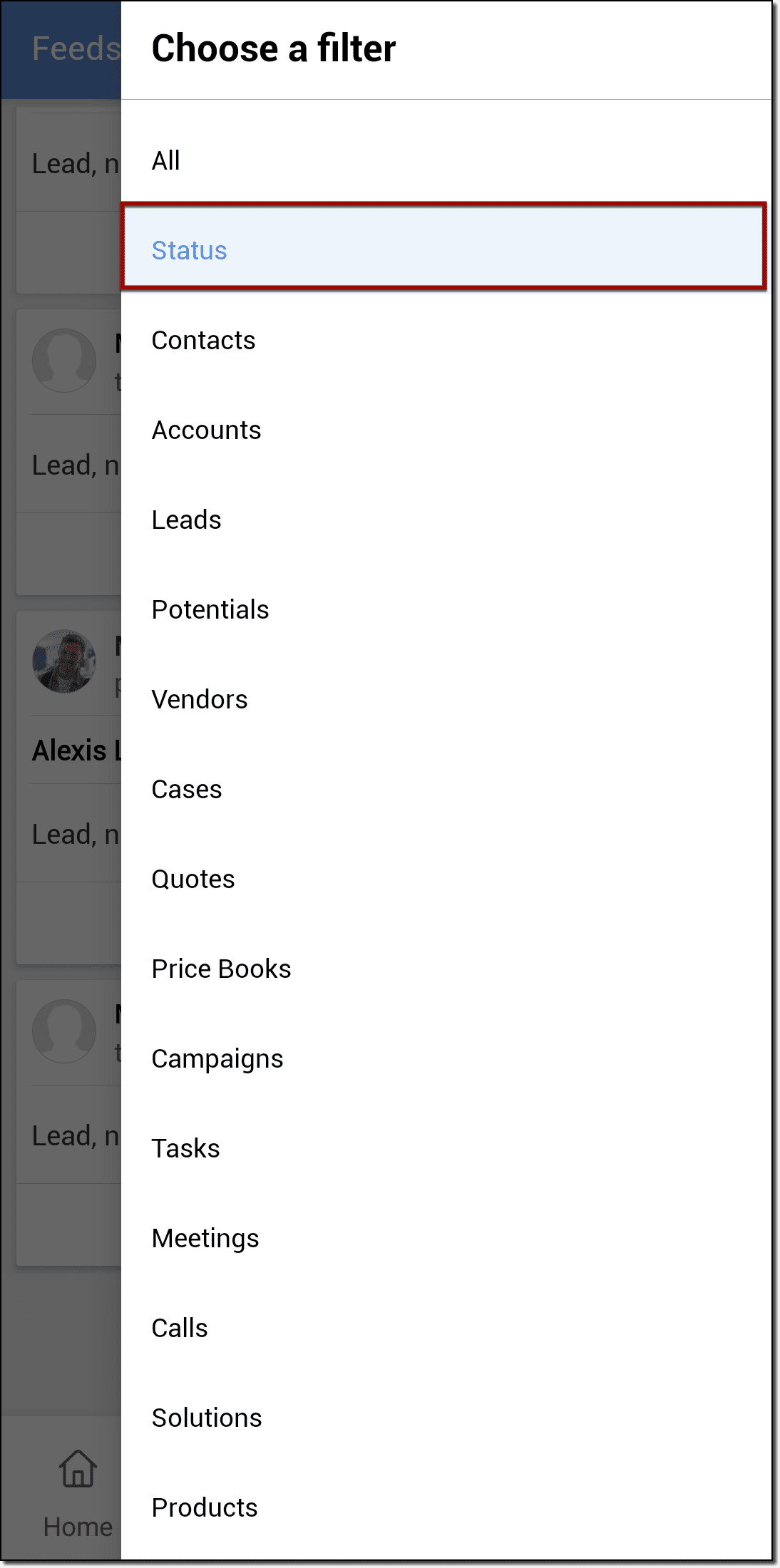 Feeds in Zoho CRM for Android let you collaborate with your peers and keep track of your organization's activities, both your own and your colleagues. Feeds lets you post and view status updates, add comments, attach files, and filter updates by module.
