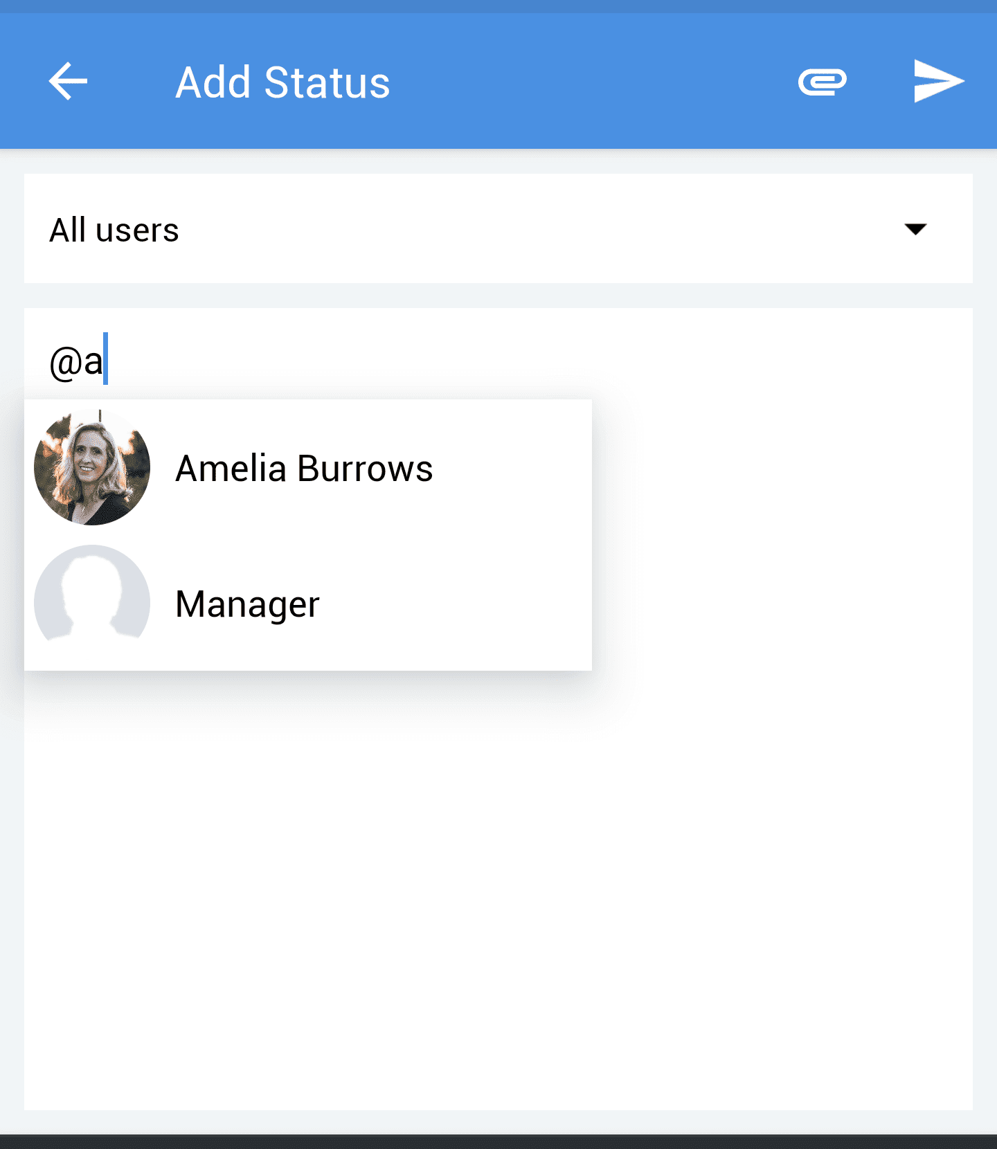 4. To mention a user, enter @ and type their user name. Choose the required user from the list of names.