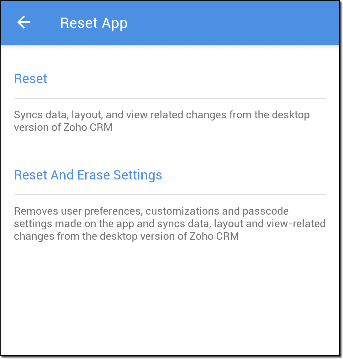 You can use the Reset option to update the Zoho CRM app with the latest data from the desktop version, including custom modules, components, record data, and more. The app settings you have configured on the device such as themes, grouping, and sorting will not be changed. Any data you added to the app which has not been synced with the desktop version will be removed.