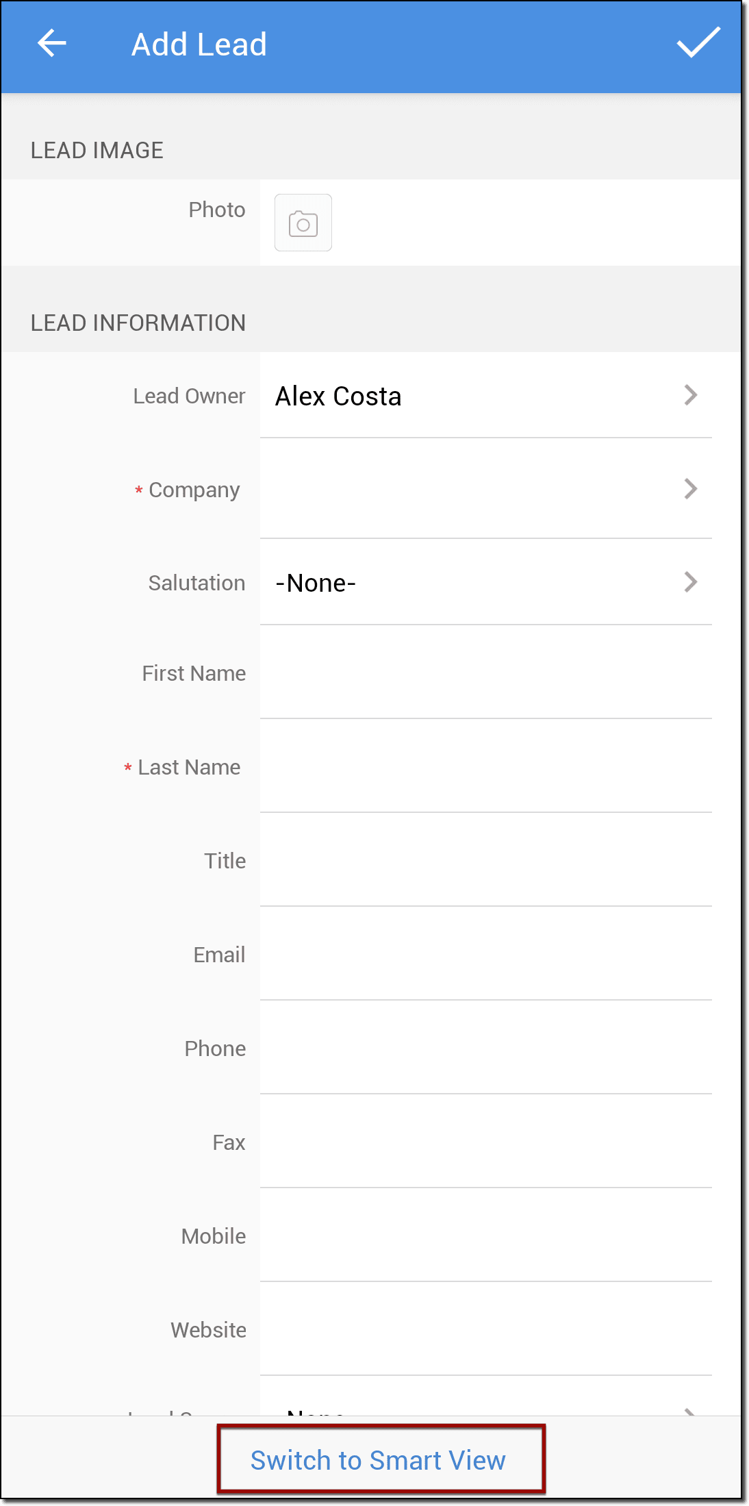 The Smart View is a mobile-friendly view that is available for any module in the Zoho CRM Android app. It mirrors the Quick Create view in layouts. It is available in four situations: Add Record, Update Record, Details View, and Related Lists.