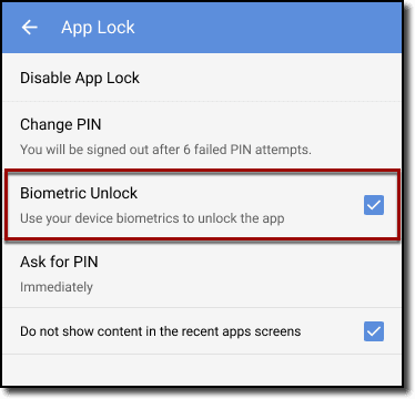 - You can also choose to unlock the app using your fingerprint. Select the Fingerprint Unlock checkbox to enable this feature.