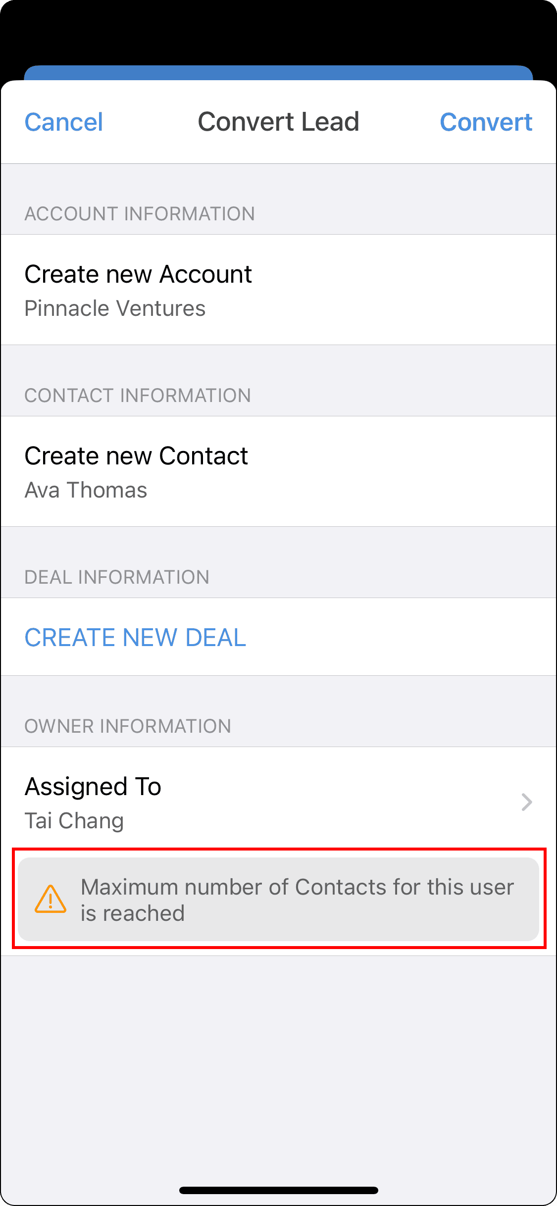 Note: To ensure you receive threshold alerts during lead conversion, set up the Assignment Threshold in the Contacts module.