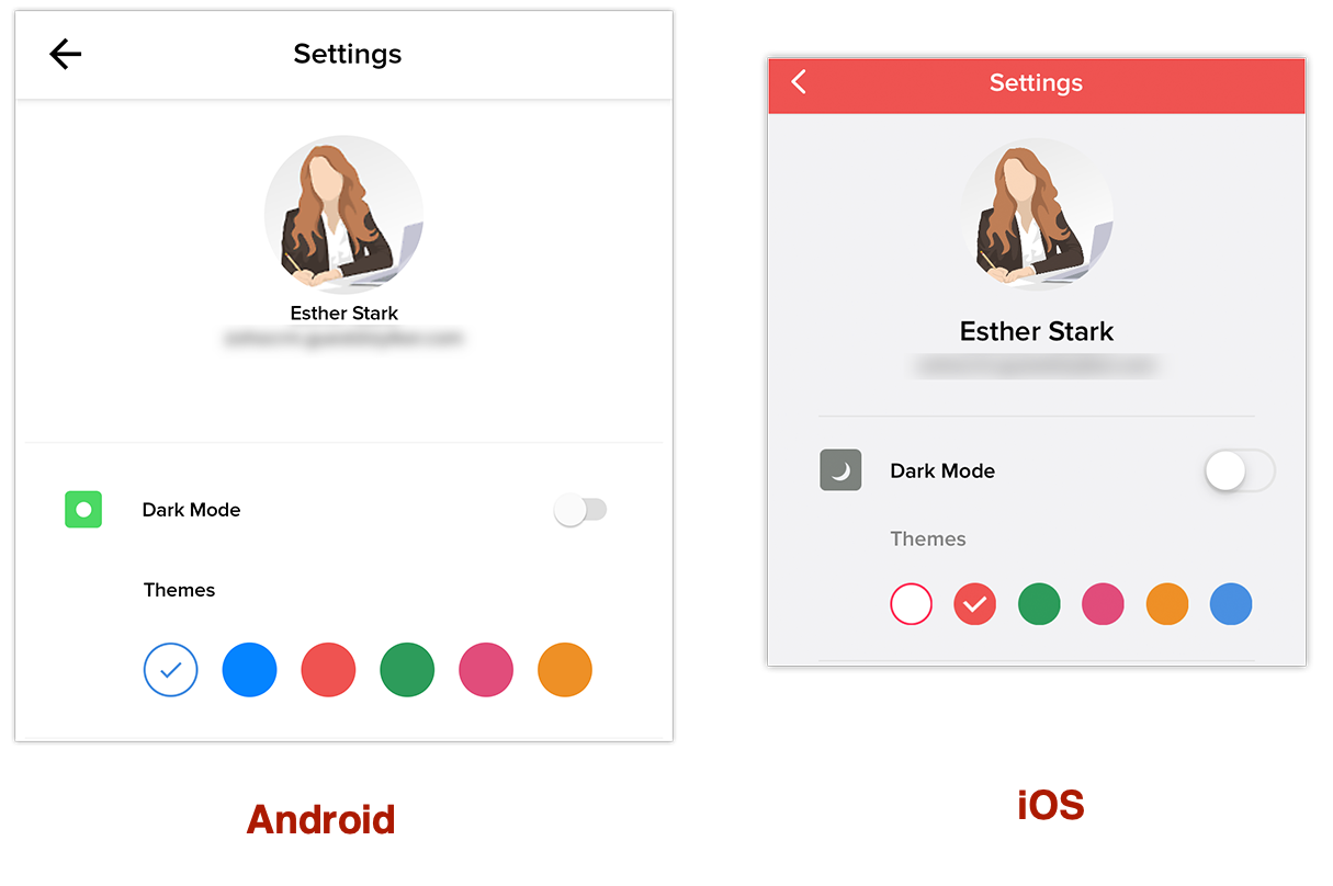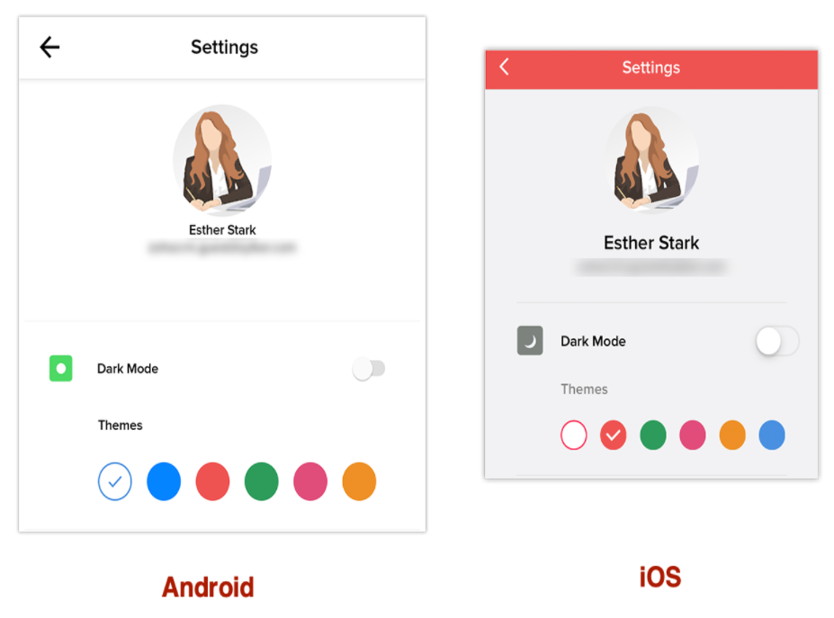 To enable the Dark Mode toggle switch to use the application with a black background or tap a color in the Themes section to be applied to the top bar of the application.