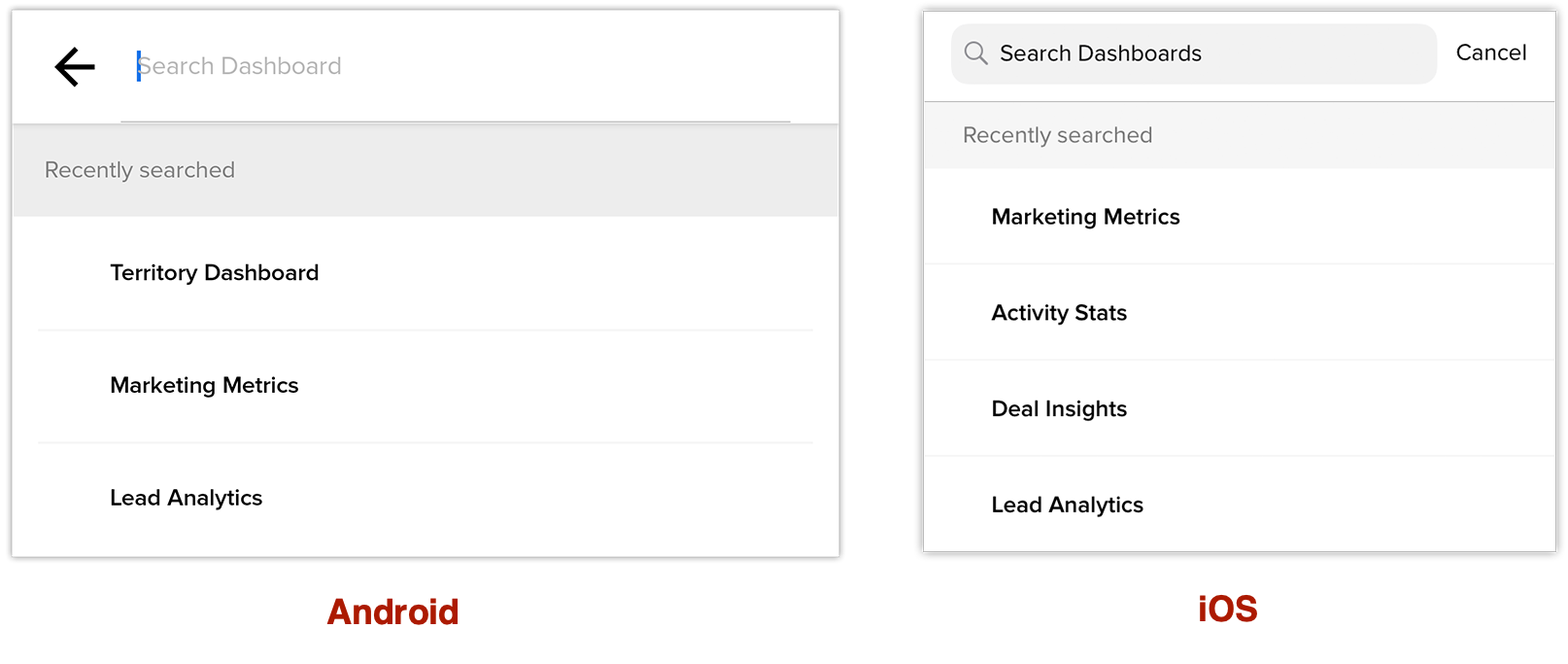 All the dashboards that you have recently searched for and viewed can be accessed by tapping the Search icon. You can tap a dashboard from the list to view it in detail.