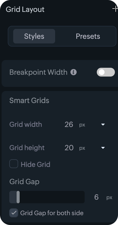 Resizing the grid gap: The grid gap or the gutters are the space between each grid. Resizing this space will leave space between elements placed on grids. You can resize the gap for both sides, or resize for columns and rows individually as desired.