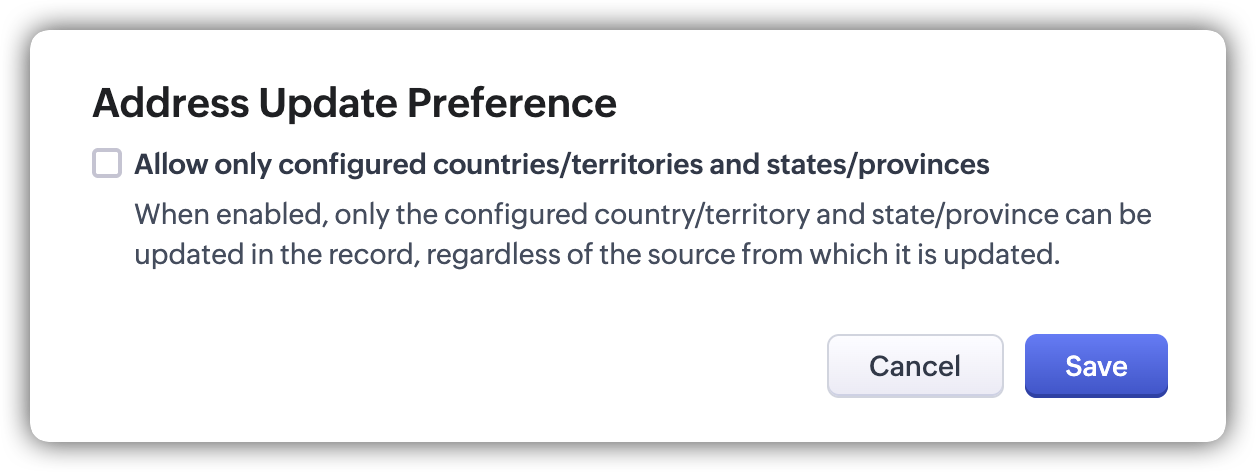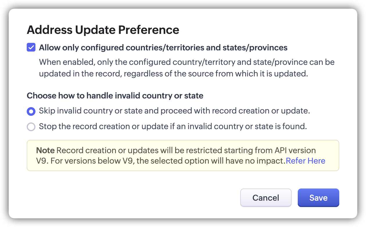 When configuring the country and state list, you can also control whether CRM should accept only the values you’ve configured, and how to handle invalid entries.