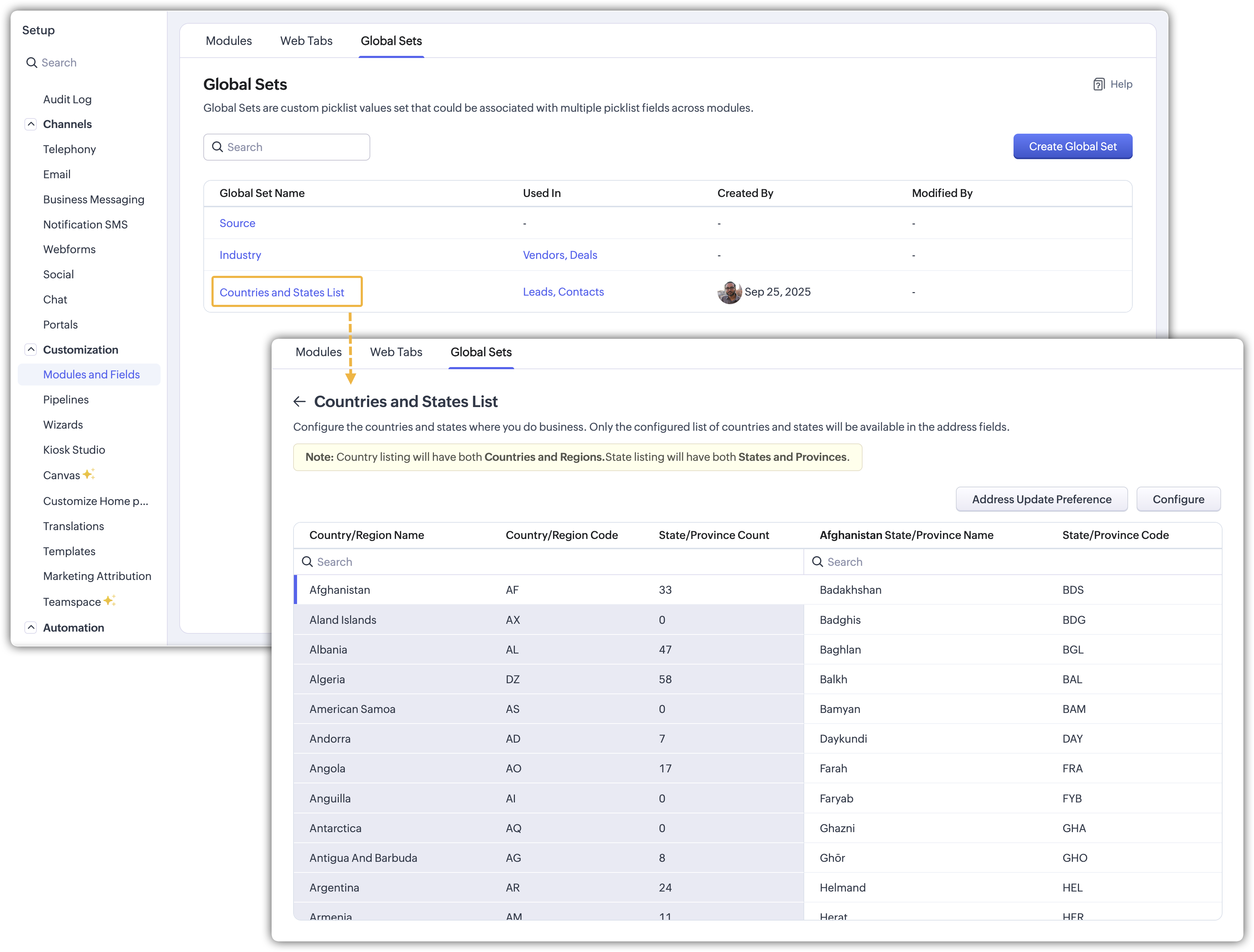 If your business works in specific regions, you can also control the list. For example, you might only want to show a limited set of countries where you operate, or add custom state values for regions you serve. This flexibility is handled through Global Sets in Setup.