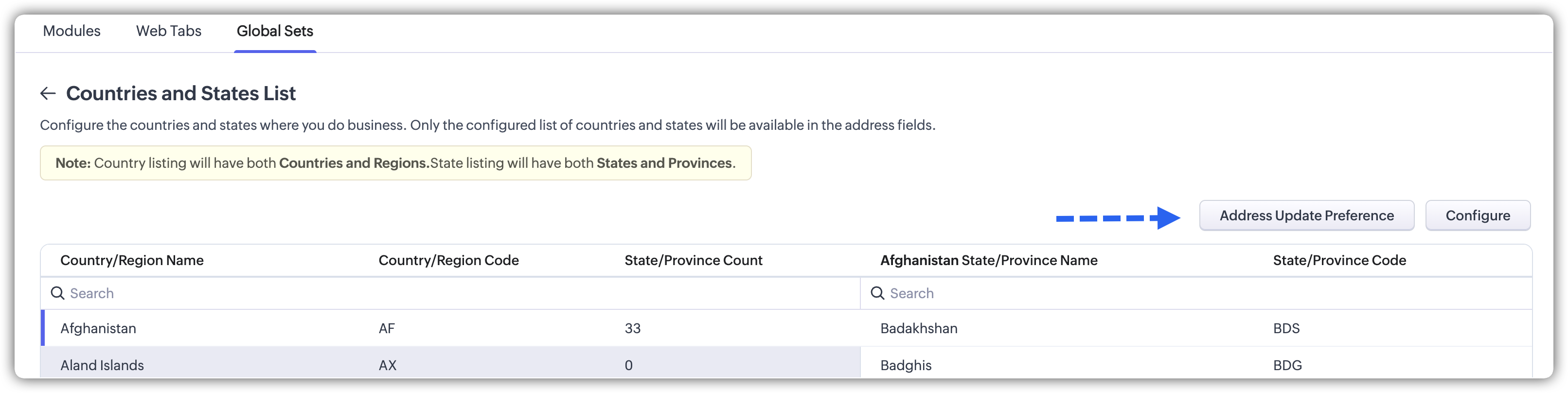 Once configured, these values automatically appear in every Address Field across your CRM.