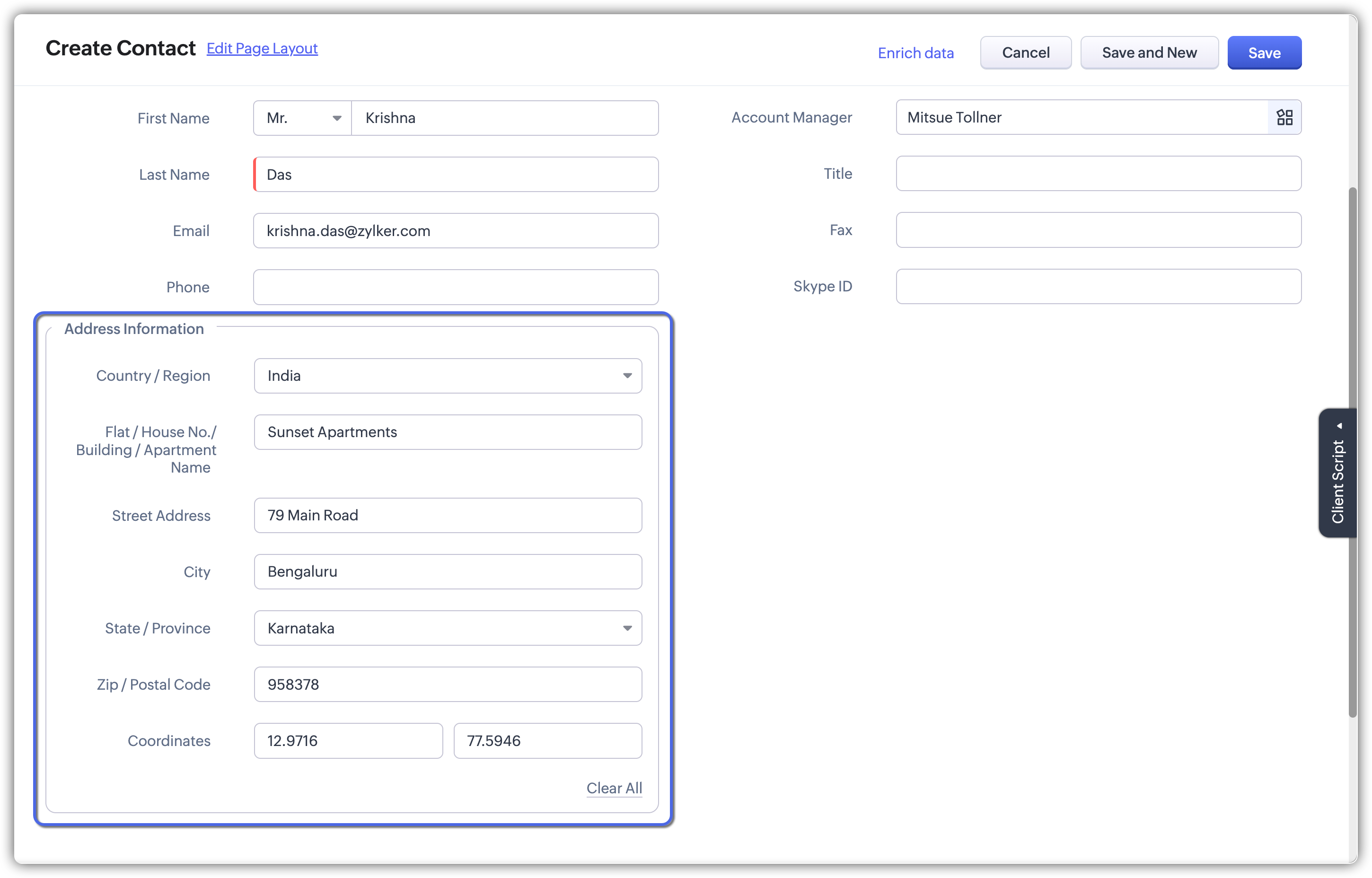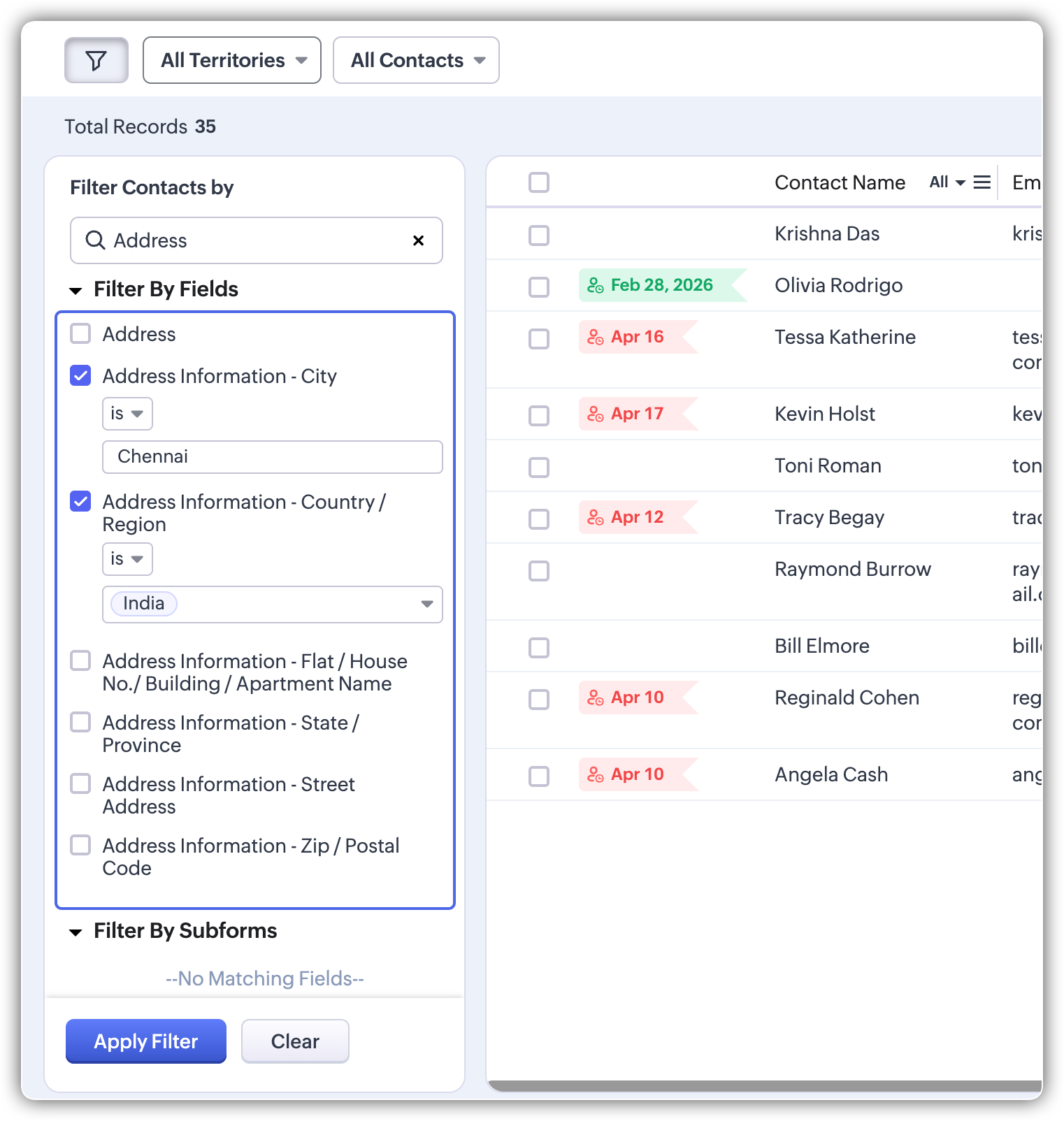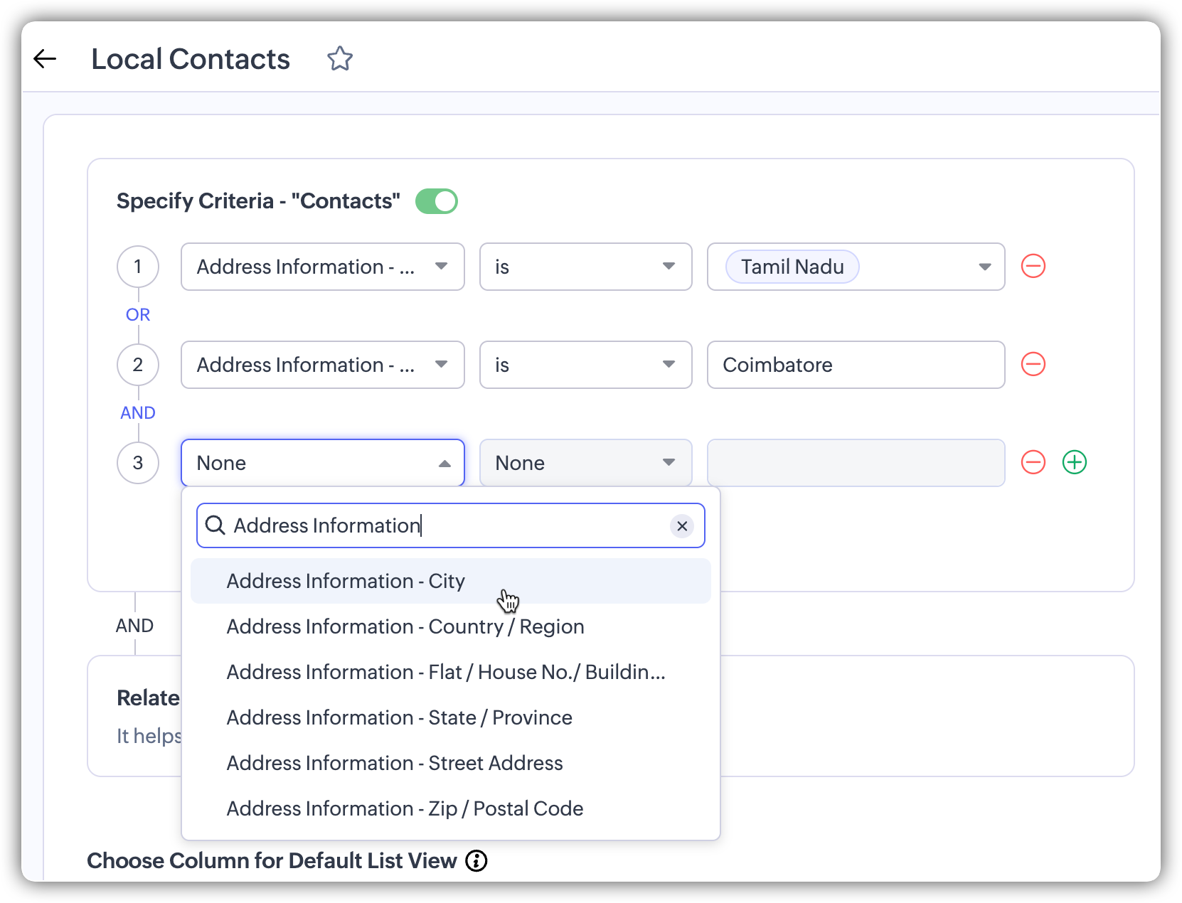 The Address Field is more than just a structured input box. The details from the subfields can be used across CRM for filtering, adding criteria, and viewing records.