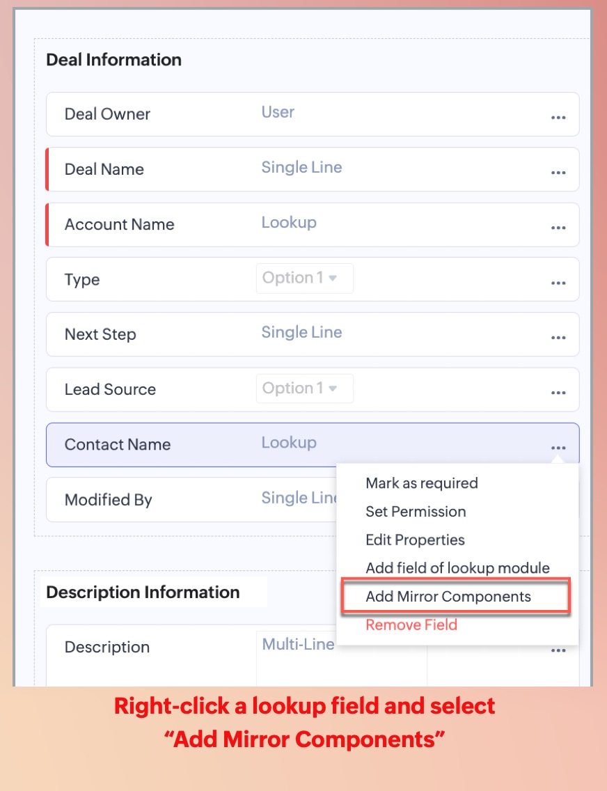 - If the Lookup field already exists, then you can click more options and use Add Mirror Components and choose the required fields to be mirrored.