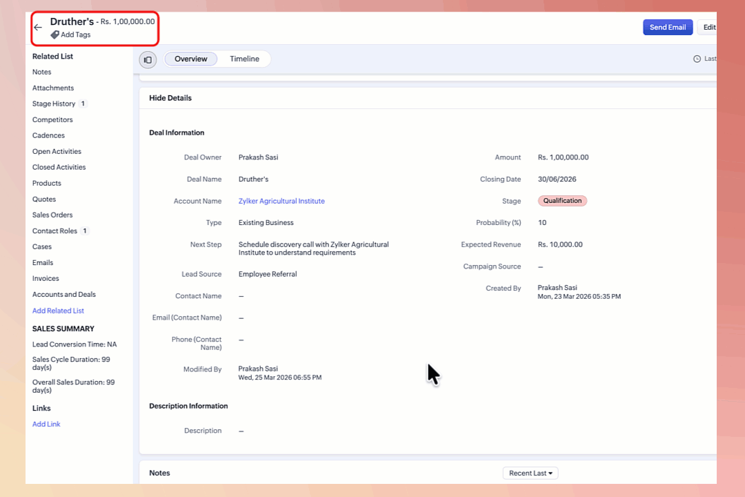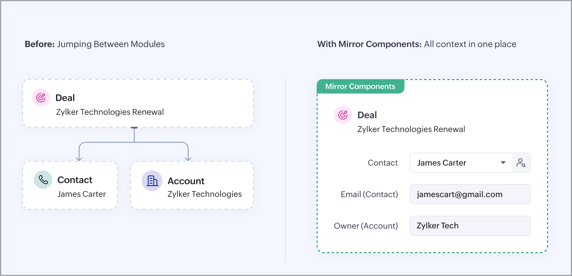 Take Zylker Travels, for example. Their sales reps handle multiple calls from customers enquiring about booking status, package details, and payment information. Every deal is linked to a Contact, an Account, and a Product — and to answer a single query, reps would have to open the Deal, then the Contact, then the Account, then the Product. Four records, just to piece together one conversation's worth of context.
