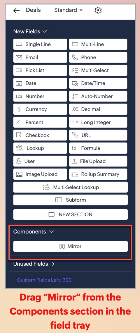 - Field limits: Zoho CRM supports up to 100 mirror fields per module, across a maximum of five lookup fields. For instance, one can add up to 100 mirror components for one lookup field or 20 mirror components for every five lookup fields.