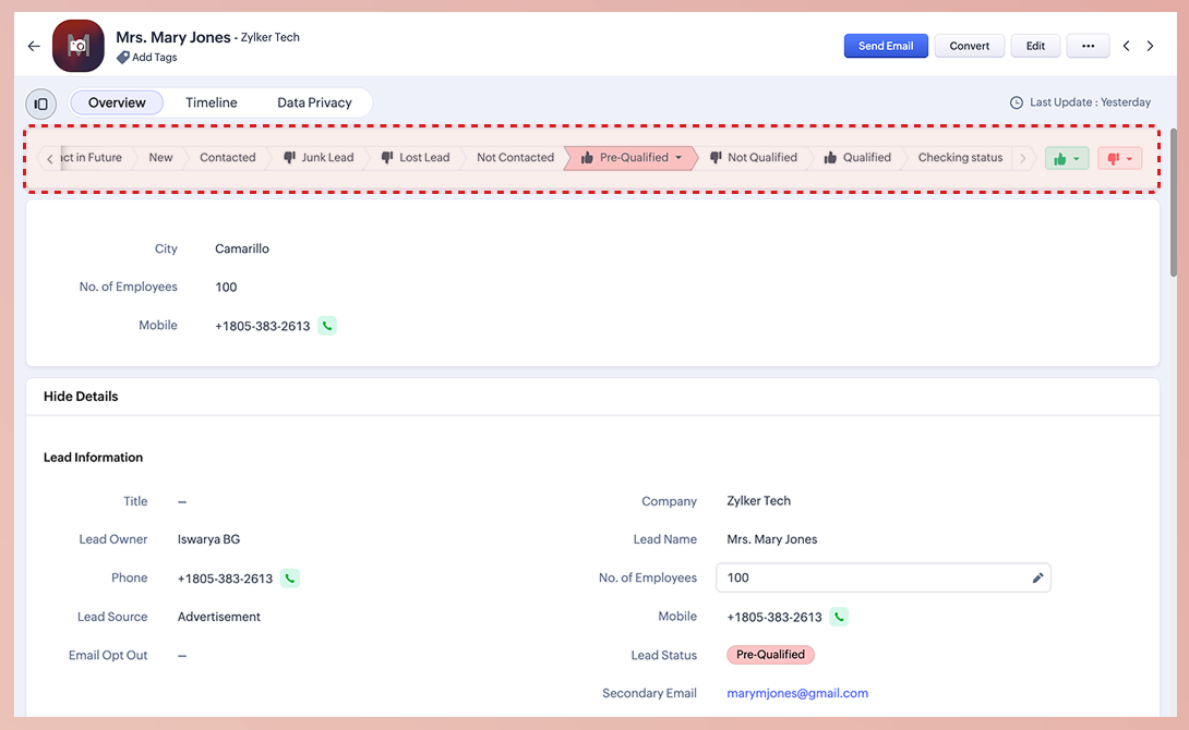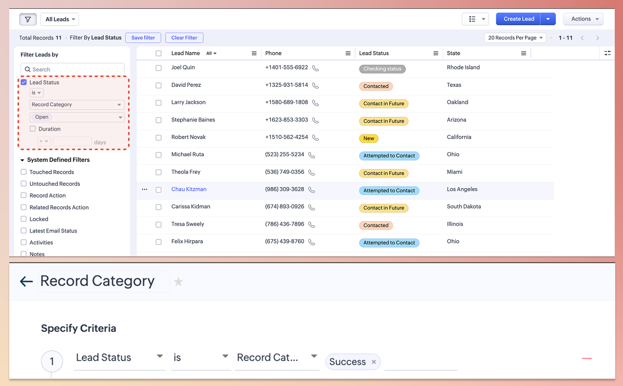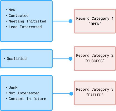 Record category makes this easier by allowing you to group related Lead Status values into broader categories. This gives you a consolidated view of similar records, helps you instantly understand where the lead stands, and enables quicker navigation and action without you losing access to the detailed status information.