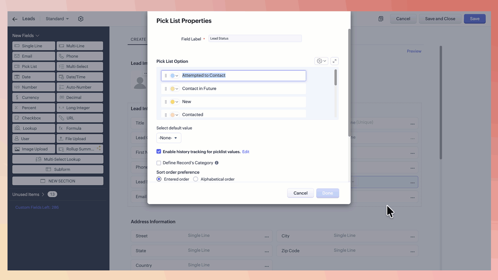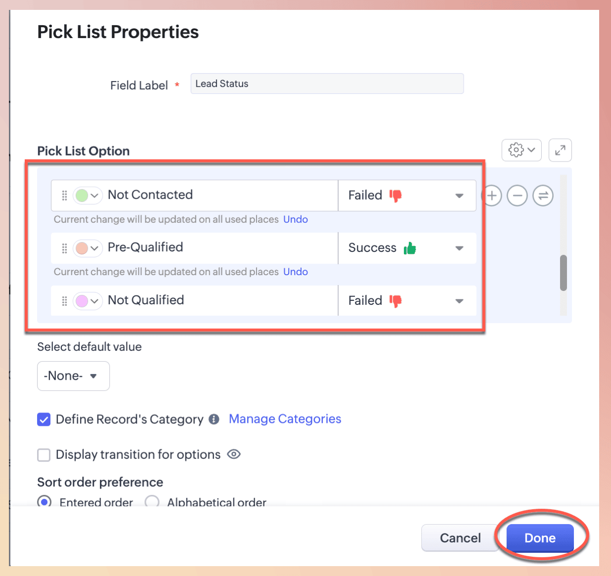 In the above scenario, for the Lead Status options, we have a common grouping: we saw that the user configured Record Category for the Lead status picklist field. Each existing value was then mapped to one of these categories based on its outcome. Users can see this and infer the status of the records. Besides, users can also view, filter, and act on records based on these categories by using Record Category which you will see in detail below.