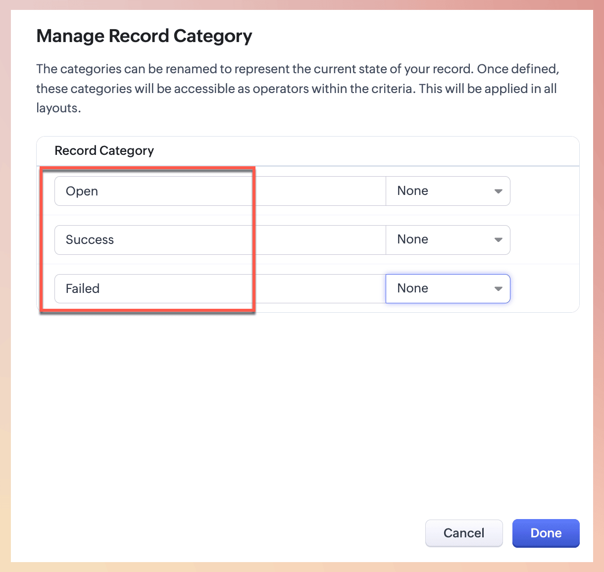 To achieve this, the user needs to enable Define Record Category. On doing so, the user can now define the categories as the default Open, Success, Failed, or as any custom categories as well.