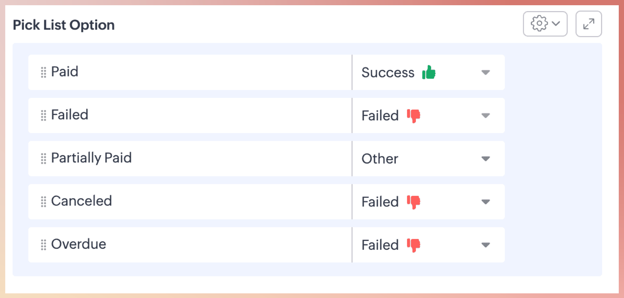 - In the Payments module, multiple deal or payment related stages such as Payment Declined, Transaction Failed, or Refund Initiated, can all be classified under a single category such as 'Failed'.