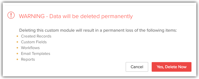 In Zoho CRM, the standard modules cannot be deleted but when there is a need to delete a custom module make sure that it is not linked to another module. Once you delete the custom module, you can't restore data from it. Before deleting make sure you have checked the following: