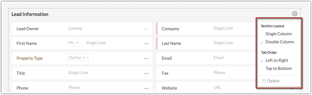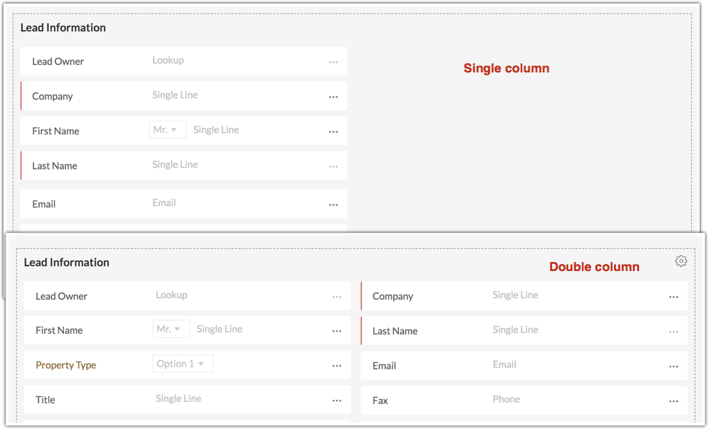 The look and feel of a module can be changed by modifying the layout. Make form fields look organized by rearranging fields and sections, and changing layout settings. For instance for your custom module "New Property" to manage property leads, you can design a layout for the section "Apartment Details" consisting of the required fields. Layout determines the structure of your screen. You can choose between a single layout and a double layout.
