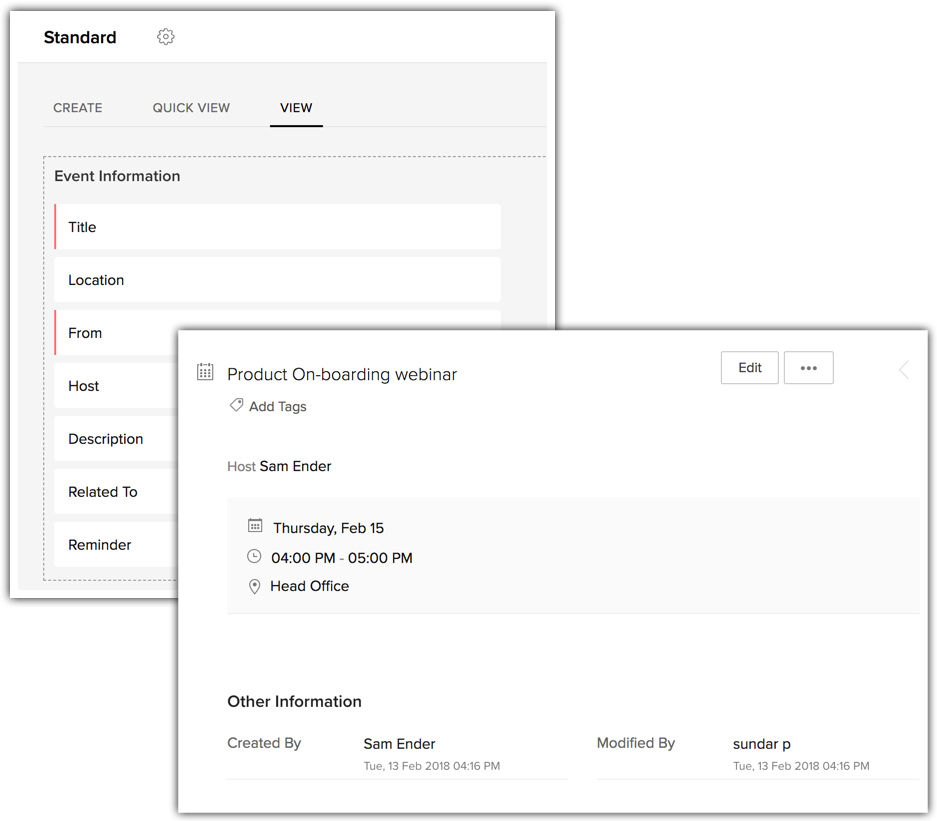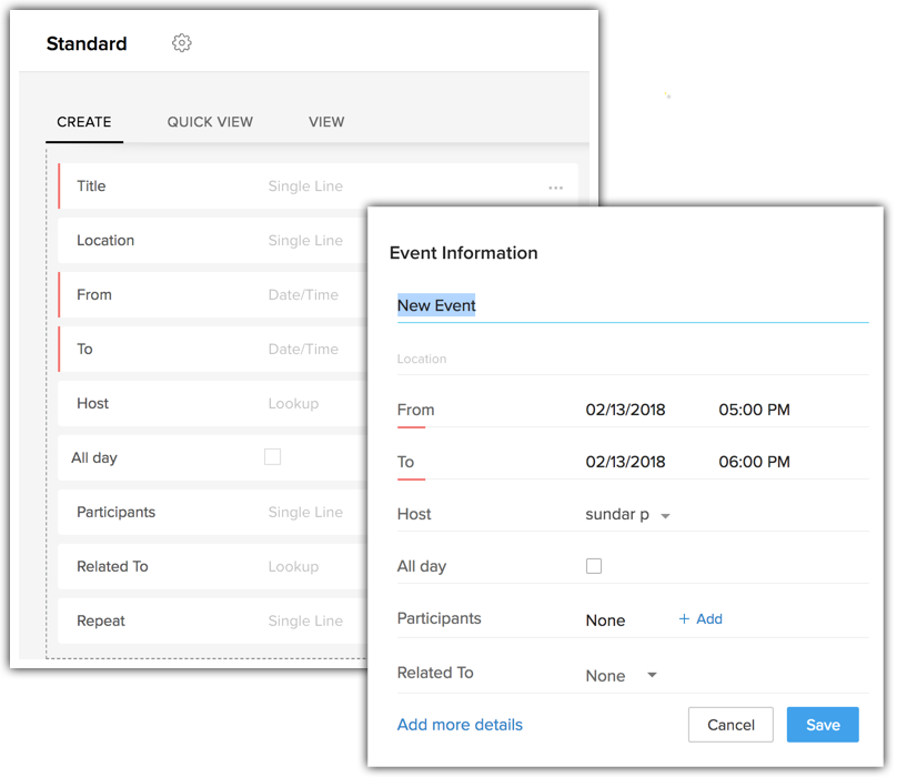 - You can add fields specific to particular layouts in Quick Create and Detail View. Learn more on adding fields.