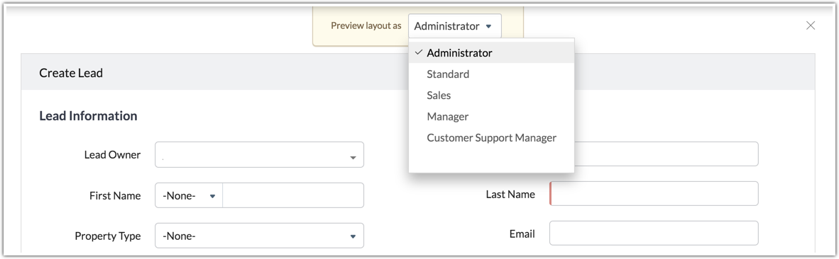 - Preview the module layout as a particular profile. This is useful if you have given different Field Permissions for different user profiles.