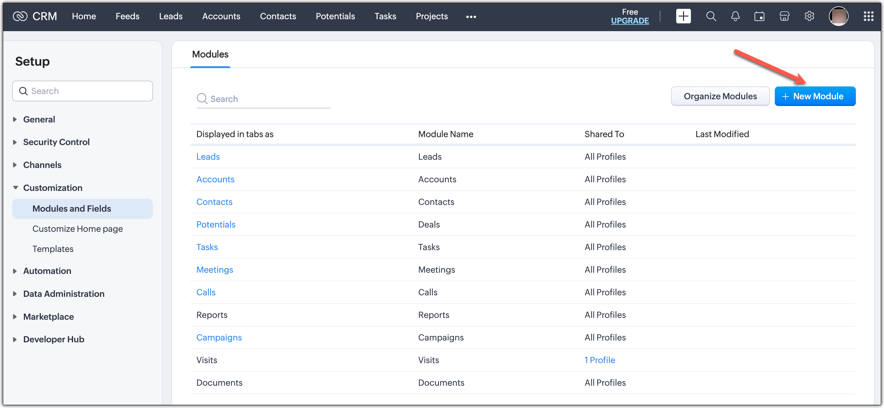 Sometimes, the standard, predefined modules present in Zoho CRM do not always meet your requirements. In such a case, Zoho CRM lets you create a new module depending on your business needs. For instance, Leads, Contacts, and Deals will not be ideal for an educational institution. Students, Teachers and Parents would be more appropriate modules for them and they can create these modules. A hospital can create new modules called Doctors, Patients, and Nurses.