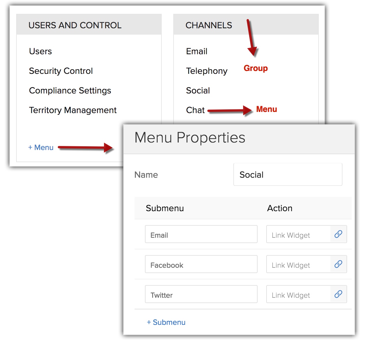 Each application that you add is called a submenu and all these submenus are collectively called a menu. For example, in the standard setup under Channels group Social is a menu that hosts several features like Twitter, Facebook and Google+ which are the submenu. As per your requirement you can add a menu and submenu to the groups in the setup page.