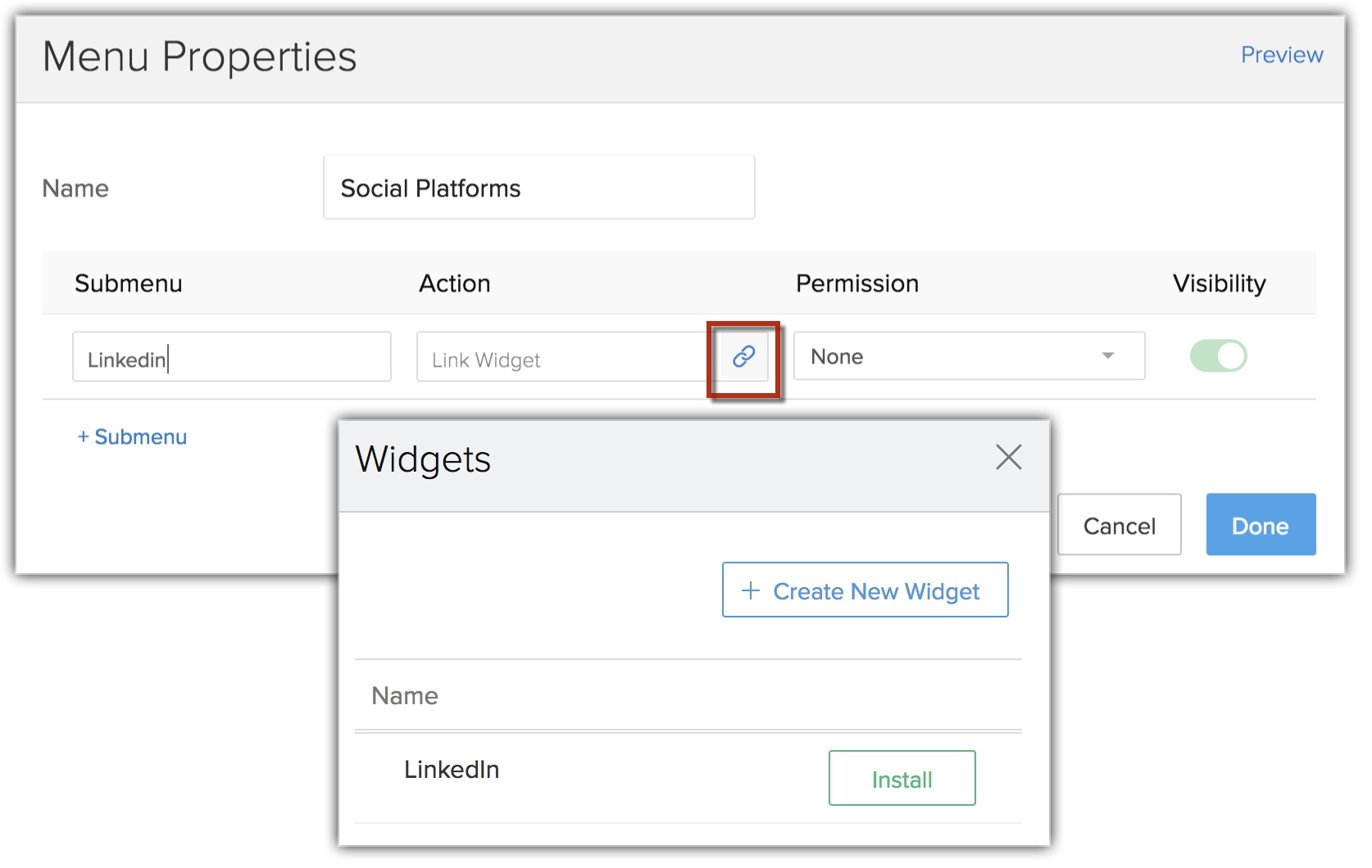 Adding an action requires you to link the application that you added in the submenu to a widget. You can either link the submenu to an existing widget or create a new widget and link it.
