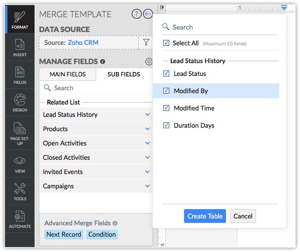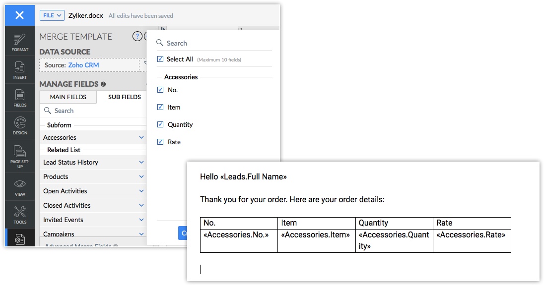 Building a mail merge template from the scratch makes template creation easier. The merge fields from the module you have chosen in the above step will be displayed under Insert Fields section. All you need to do is click on the required fields, that will get added to the new template.