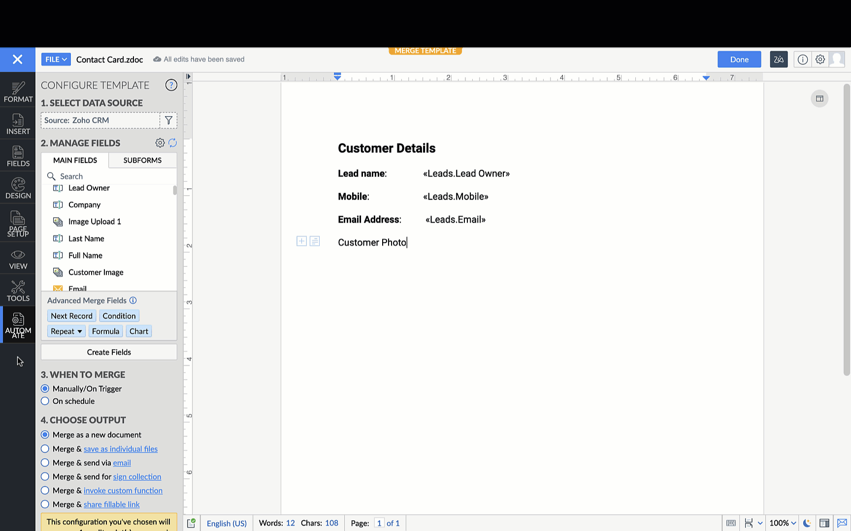 Mail merge is a function that helps you to simplify repetitive tasks to create personalized documents (forms, letters, address labels, envelopes, etc.). You can create a mail merge template which contains variables (merge fields), which will merge data from Zoho CRM and create merged documents with the correct information for the variables.