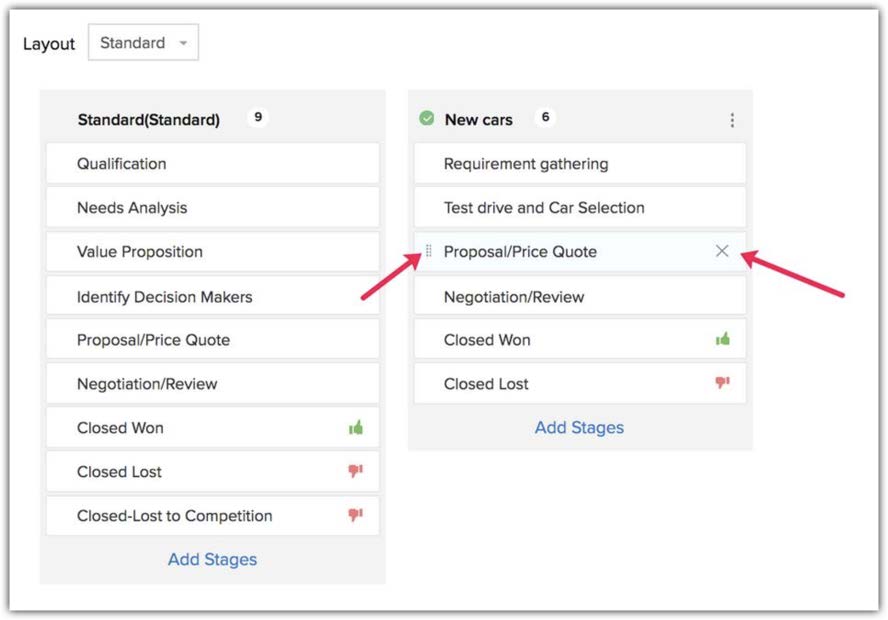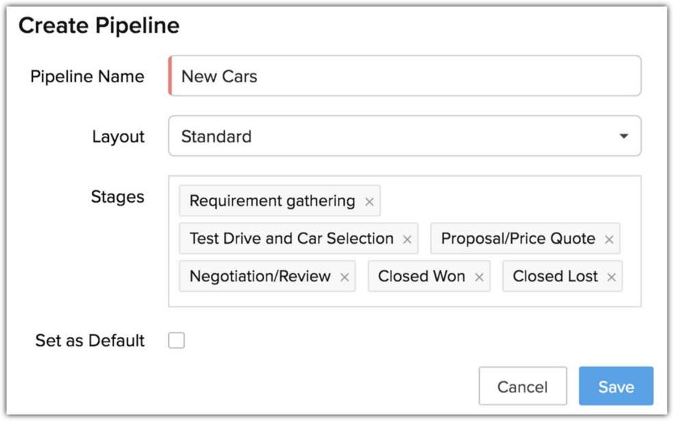 As every process is different, putting all the deals through a single pipeline will not give a clear understanding of their progress. Therefore, Zylker Cars needs to create multiple sales pipelines to more accurately show how a deal is progressing.